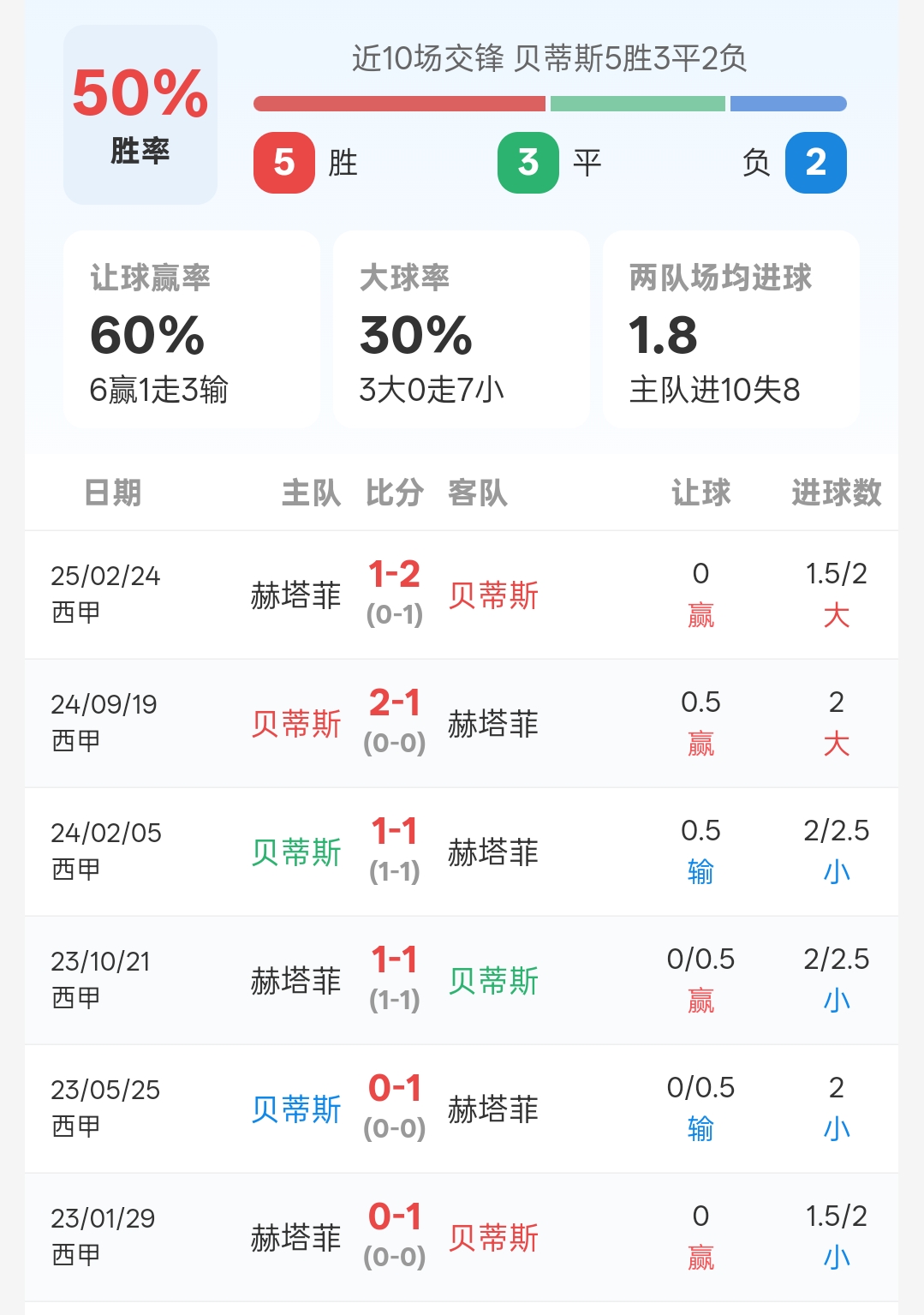 综合分析:此役是主场强势火力与客场低迷攻防的对决,贝蒂斯坐拥主场优势、状态更稳、历史交锋近10次5胜3平2负占优,且战术上能精准打击赫塔费客战与进攻短板,尽管后防有伤病但整体实力与战意更足。赫塔费进攻乏力、士气受挫、客场疲软,难以抵挡贝蒂斯的攻势,贝蒂斯主场取胜概率较高。