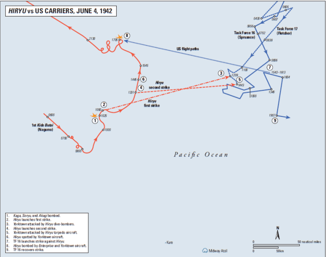 弗莱彻出于自己谨慎的作战风格,他于早些时候派出去的舰载侦察机如今终于有了搜索成果。14:45时,一架从美海军“约克城”号航母起飞的舰载机报告了日军“飞龙”号航母的侦察位置。这是VS-5两位飞行员个人主动扩大搜索范围的另一个战例成果,这也让南云忠一海军中将更加命运多舛,因为他在早些时候决定驶向美海军舰队,而不是利用自身舰载机的航程优势,既可以躲避美海军舰载机的空中打击,又可以保证美海军舰队在自己的作战半径范围之内。