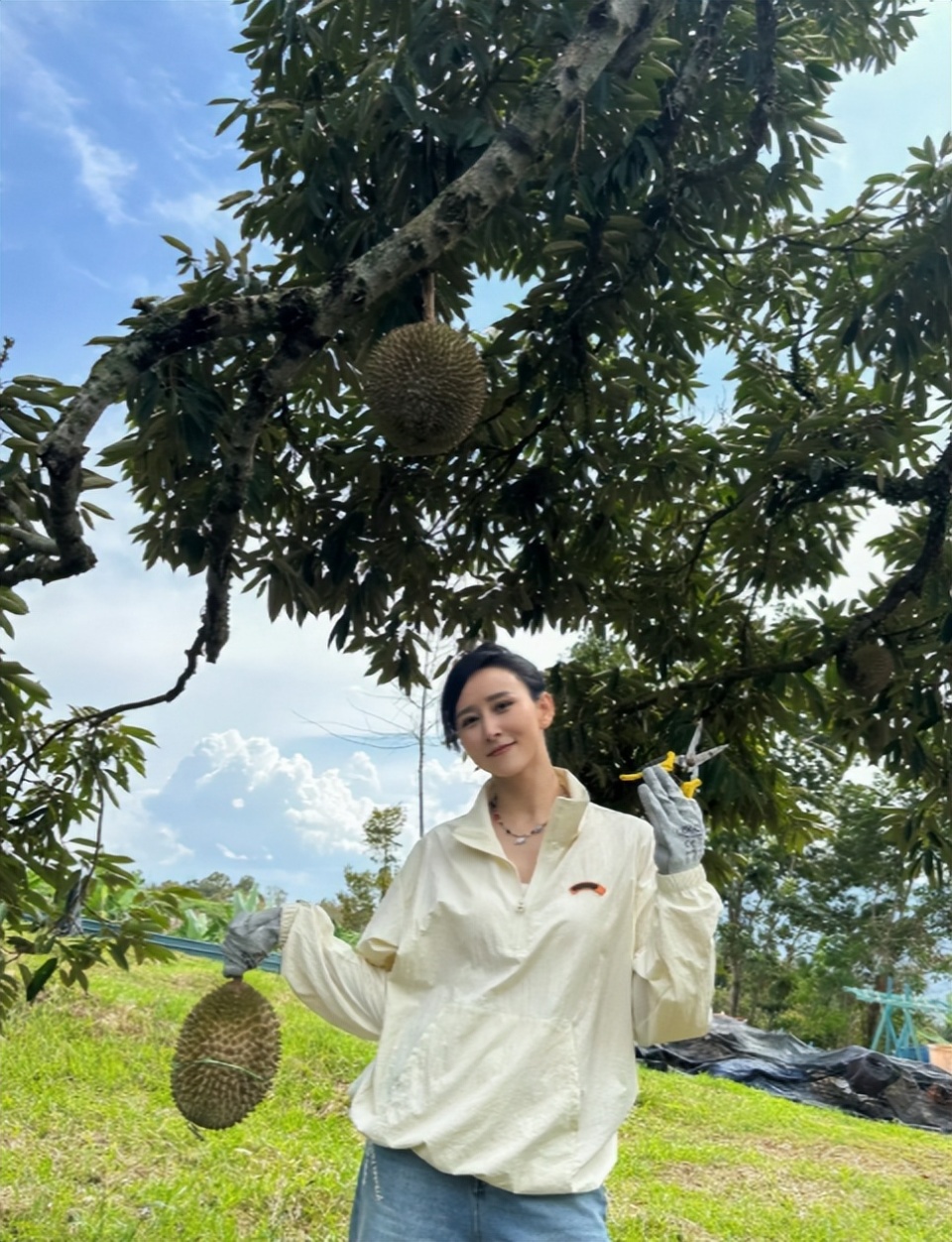 她戴着专业的防刺手套,小心翼翼地把榴莲剪下来,动作熟练得就像一个资深果农。