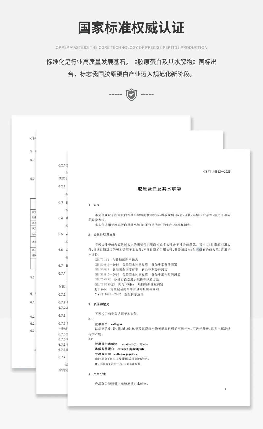 日前,国家市场监督管理总局和国家标准化管理委员会正式发布了国家标准GB/T 45992-2025《胶原蛋白及其水解物》。作为我国胶原蛋白肽行业的先行者,掌握精准制肽核心技术的企业,汉诺森所在集团公司及相关专家也参与了该项国家标准的起草制定工作,填补了我国胶原蛋白行业长期缺乏国家标准的空白。