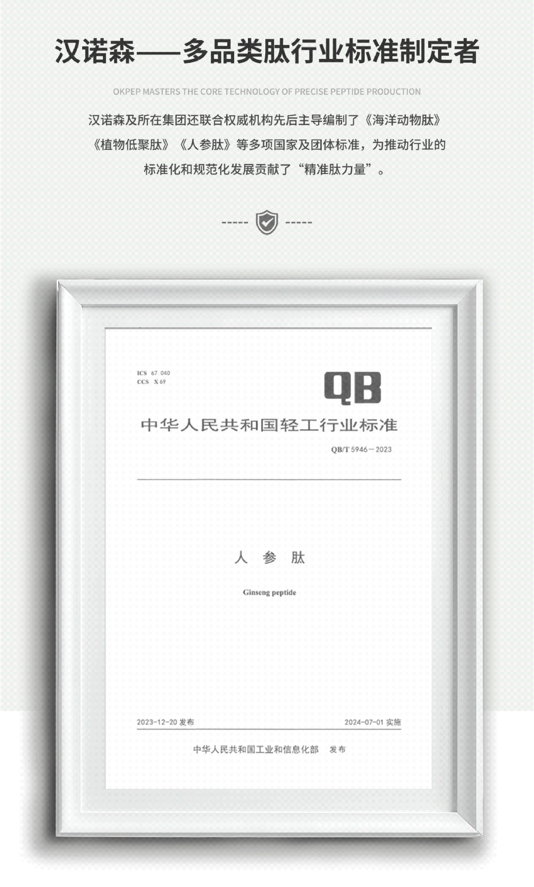除了刚刚发布的《胶原蛋白及其水解物》国家标准外,汉诺森及所在集团还联合权威机构先后主导编制了《海洋动物肽》《植物低聚肽》《人参肽》等多项行业及团体标准,为推动行业的标准化和规范化发展贡献了“精准肽力量”。