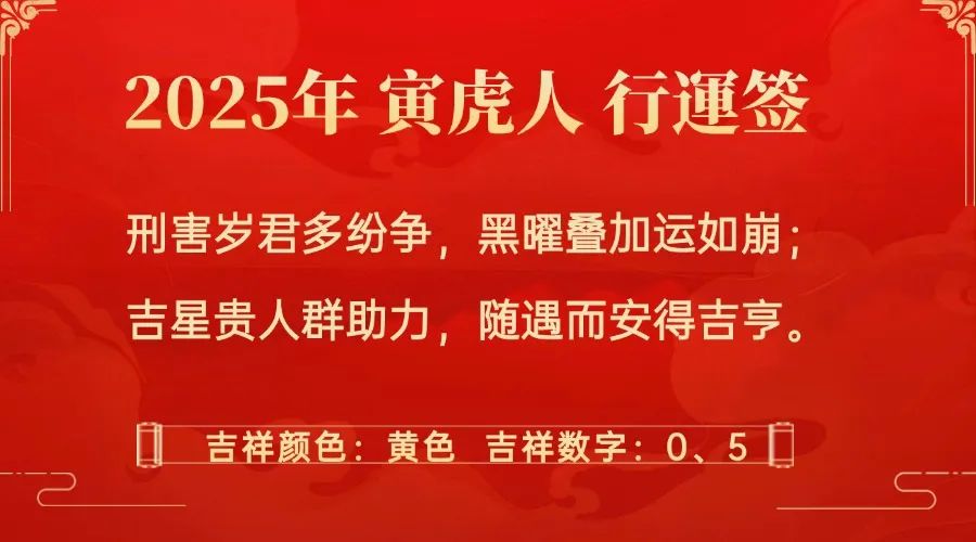 进入2025乙巳年,岁星巳中本气丙火为属相虎之食神星,流年天干乙木为其劫财星,呈现天劫地泄之象,全年元气稍显不足。同时流年虽不乏吉星助力,但诸多黑曜暗藏是非与意外,故整年肖虎的朋友虽要付出较多的精力与时间以应付不时出现的状况,难免身心疲惫。