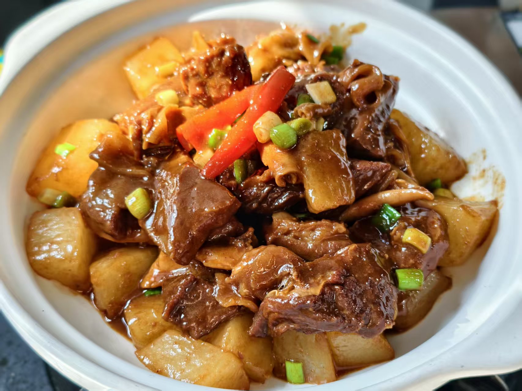 等香气浓到化不开时掀开盖,牛腩已炖得软糯通透,筷子轻碰便微微颤动,入口是浸满汤汁的鲜醇,筋肉相间处带着恰到好处的糯感;土豆吸尽了荤香,绵密到一抿就化,咽下后,舌尖浮起浅浅的回甘,清润又绵长。
