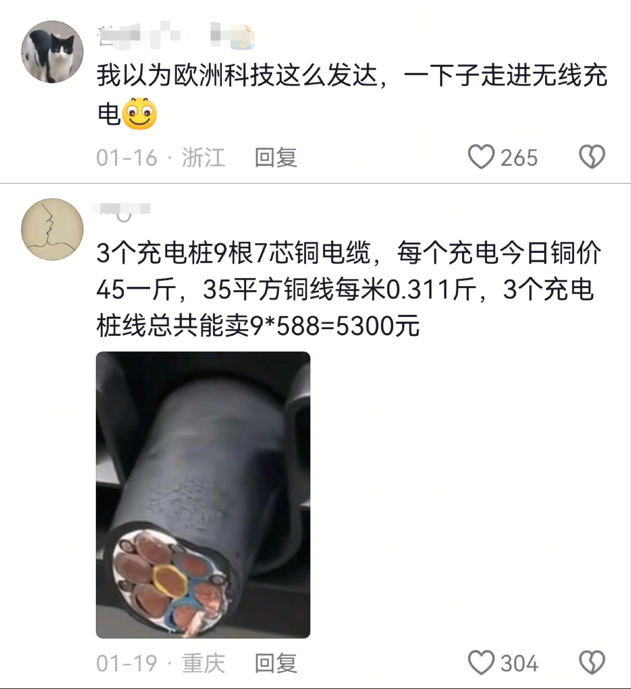 近日,一段关于西班牙充电桩被疯狂盗窃的视频在网络爆火:马路边三个崭新的新能源充电桩建立在停车位边上,然而充电枪和充电桩之间的电线却不翼而飞,被小偷齐刷刷剪断,裸露的铜丝暴露在外,得亏是枪头锁住了,不然枪头都不给你留下。更离谱的是,这些被剪断的电线是被小偷特意偷去卖钱的!传闻在西班牙,连公共设施的“零件”都成了小偷眼中的“香饽饽”。