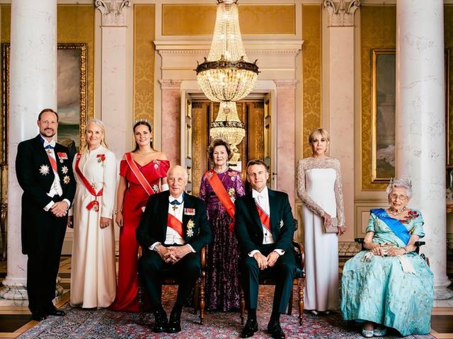 在晚宴正式开始前,宾主双方在金碧辉煌的大厅中拍摄了合影,身为哈拉尔五世二姐的阿斯特丽公主也出现了,她已经93岁高龄了,出行需要依靠轮椅。现年88岁的哈拉尔五世有两个姐姐,大姐拉格茜尔公主已于2012年于巴西去世,享年82岁。
