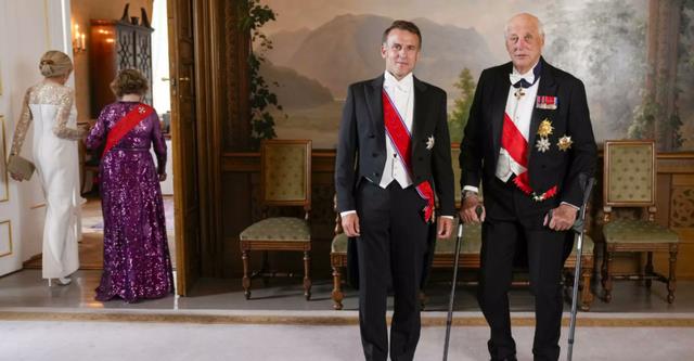 当地时间6月23日晚,挪威国王哈拉尔五世和王后宋雅,在奥斯陆王宫举办了国宴,招待到访的法国总统埃玛纽埃尔·马克龙及其妻子布里吉特·马克龙。