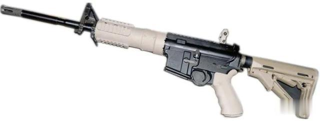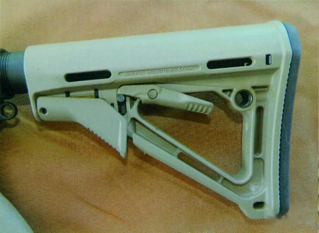 其还采用精确影像公司的碳纤维护手、艾尔高公司生产的握把、BCM枪战高手公司的超级拉机柄以及马盖普公司的CTR(Compact/Type Restricted)伸缩式枪托。精确影像公司的碳纤维护手质量较轻,但强度较好。护手四周均设有皮卡汀尼导轨,可安装多种附件。艾尔高公司的握把防滑性更好,并且握持非常舒适。BCM枪战高手公司的超级拉机柄制造精良,便于操作。CTR伸缩式枪托采用镂空结构,更为轻便,并且枪托长度定位开关设在镂空的间隙内,使外形线条更简洁,减少了钩挂的机率。该枪托长度锁定机构进行了改进,即使弹簧在长时间使用后变得松弛,枪托也不会自行松动。表尺、护手、握把和枪托为土黄色,金属部件则为黑色,两种颜色对比强烈且和谐。