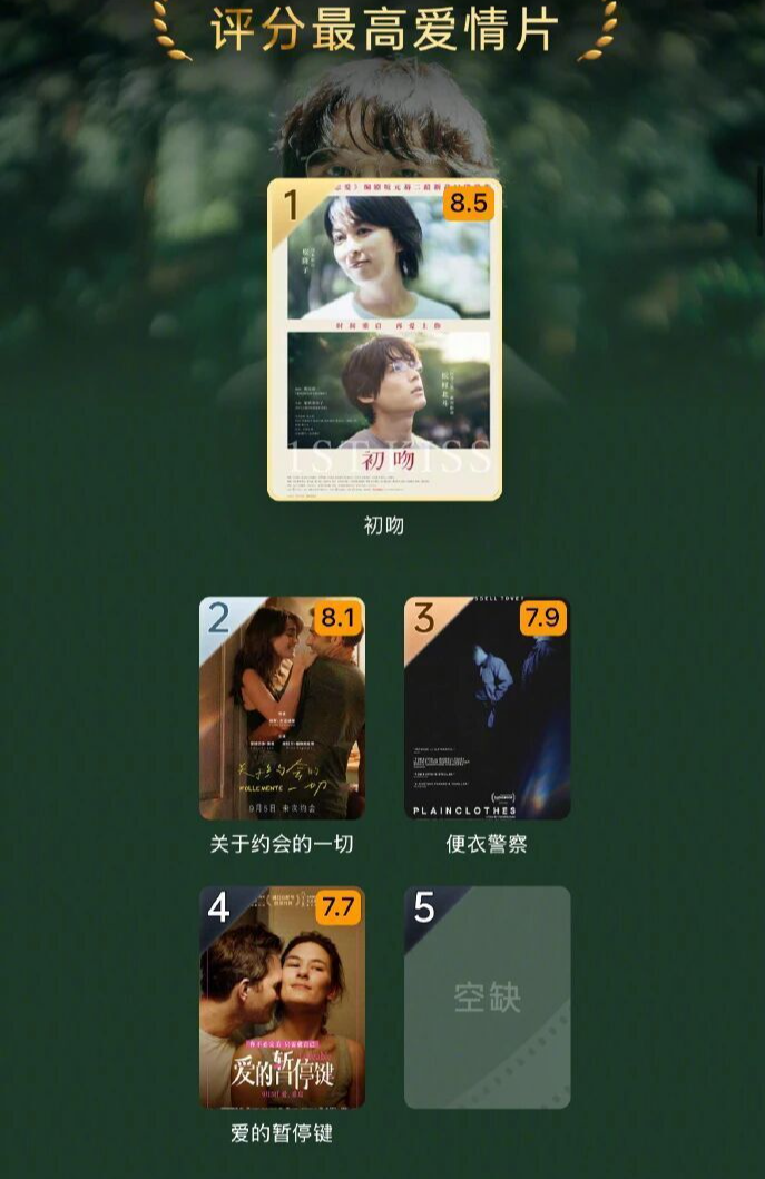 当然最惨淡的还要属爱情片,2025评分最高的爱情片连五个名额都凑不齐,真是一只手都数得过来,而榜单上仅有的四部高分爱情片均为进口片,国产电影“竟然是零诶”!