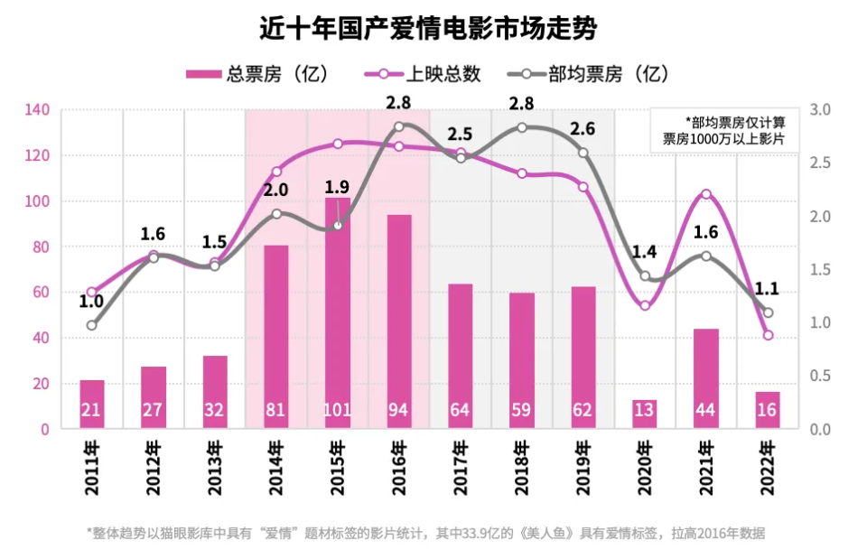 国产爱情片曾有过一段相当繁荣的时期,根据猫眼发布的《国产爱情电影数据洞察》,国产爱情电影的全盛时期在2014年-2016年,正是整个影视行业腾飞的一段特殊时期,爱情片也借着这股东风盛极一时。