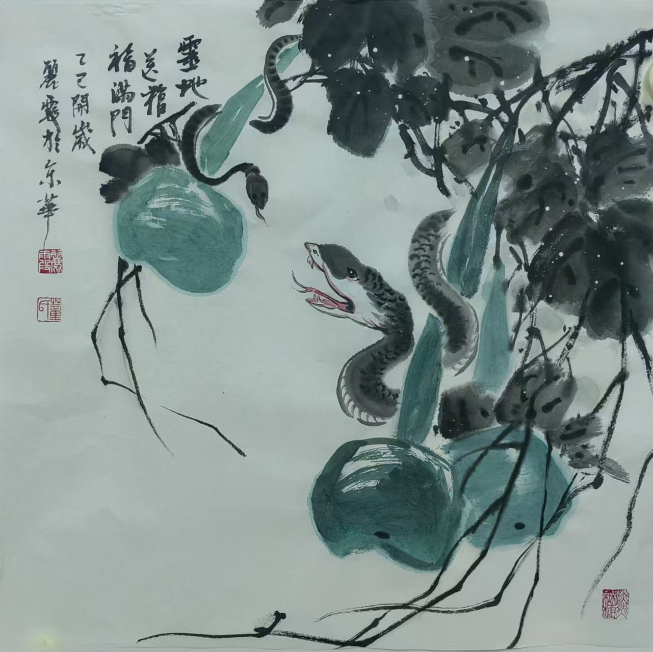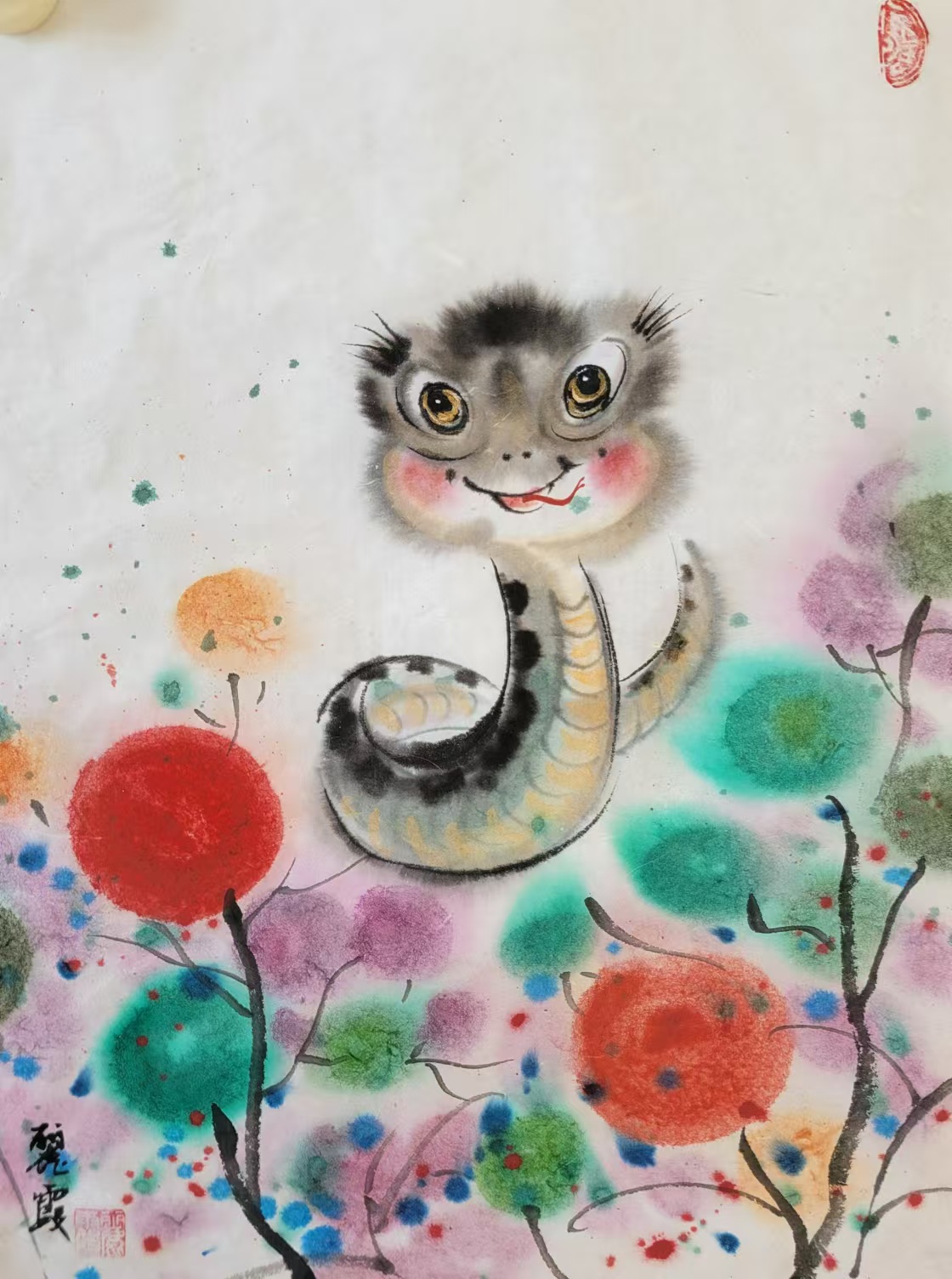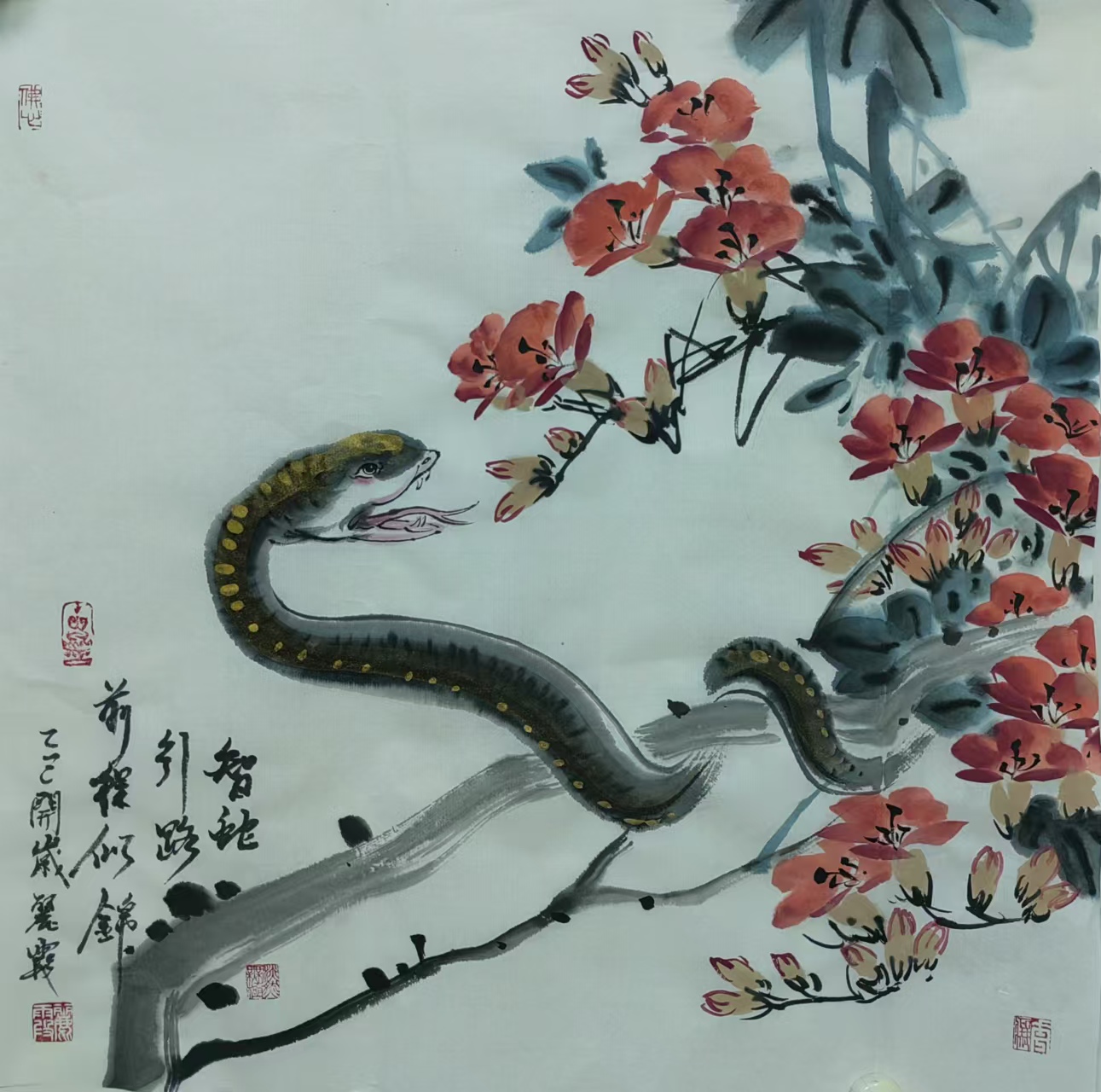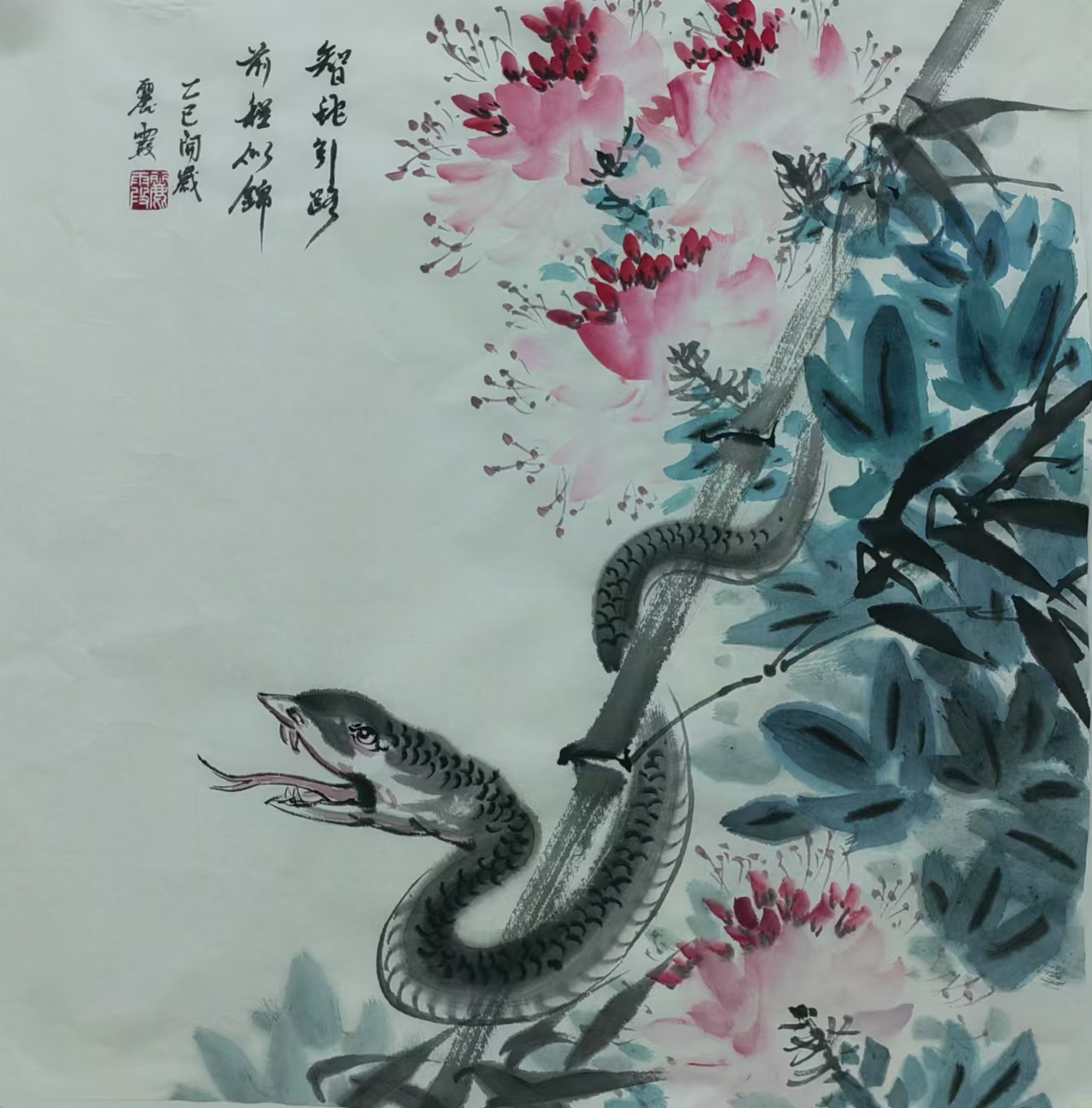 在中国传统文化里,蛇有着丰富寓意,它象征着灵动、智慧与神秘。生肖画作为中国传统绘画的重要形式,以独特艺术风格与表现力,深受大众喜爱。蛇在十二生肖中排行第六,承载着诸多吉祥内涵。“生肖文化是中华文化极具代表性的民俗文化之一,我每年都会画大量生肖画,今年从元旦至今,就画了约60幅蛇年生肖画,送给同事、亲戚和朋友。”董丽霞老师说道,她对中国优秀传统文化满怀热忱,每年都习惯以手绘新年礼物的方式,用中国画的写意技法,描绘当年生肖动物赠予亲友。