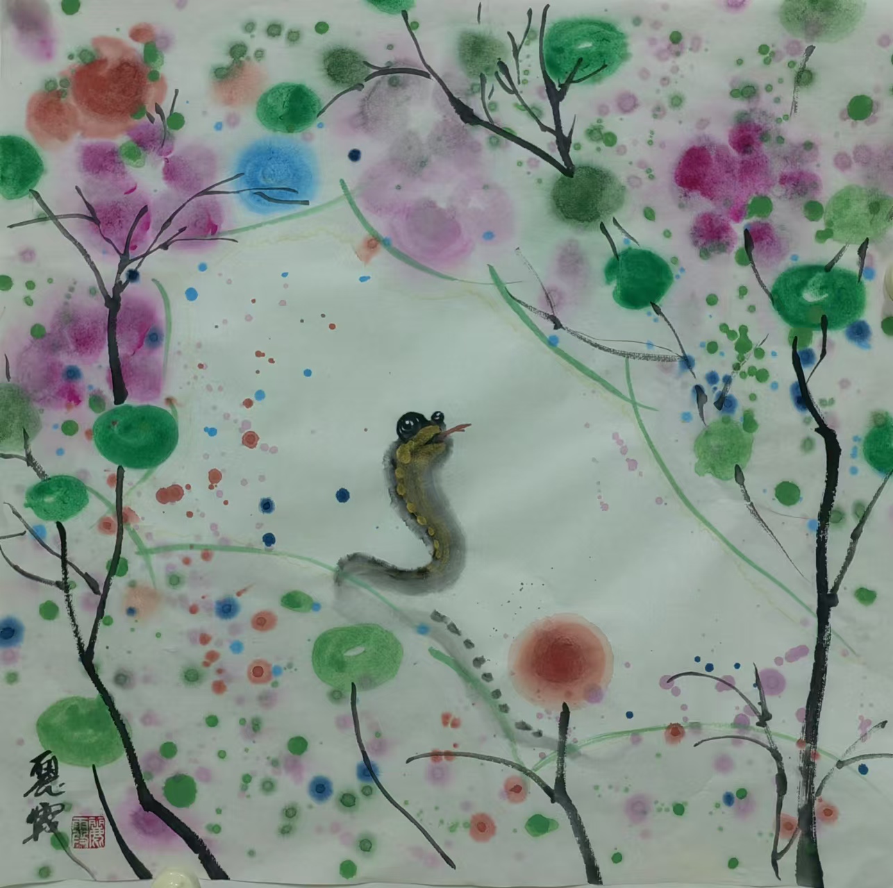 绘画技巧上,董丽霞老师巧用丰富色彩与细腻笔触,赋予画面生机活力。线条与光影变化的运用更是巧妙,让蛇的形象跃然纸上。构图方面,她精心设计,使画面具备强烈视觉冲击力与艺术感染力。