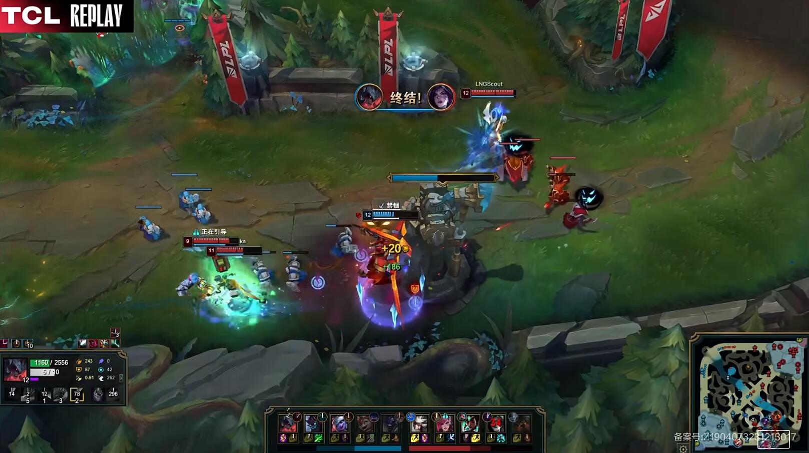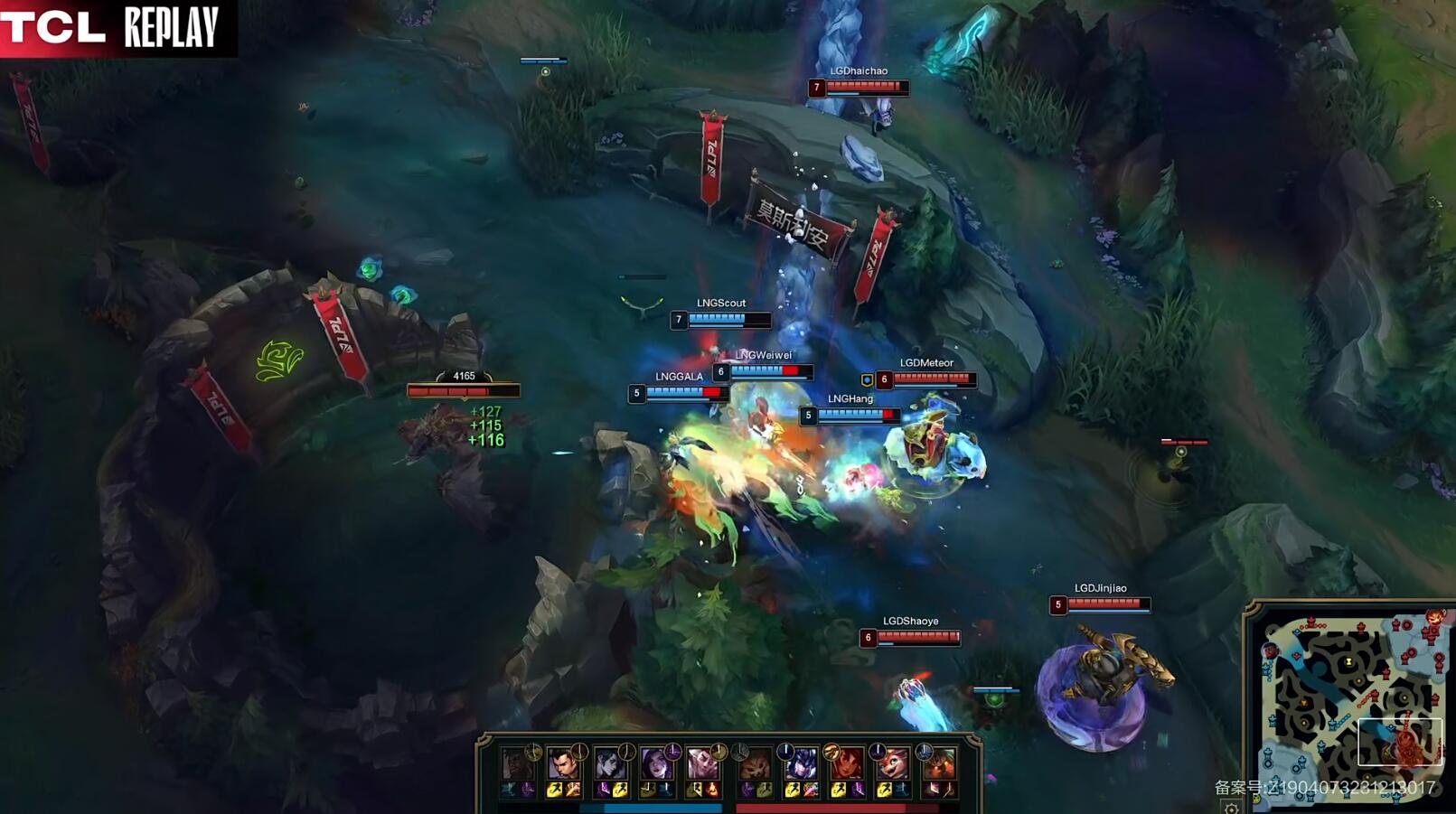 19分钟LNG抓到LGD推中路一塔的机会开团,洛先手逼掉LGD比较多的闪现,随后Scout进场大招坐住四个,LNG打出2换4将经济追平。