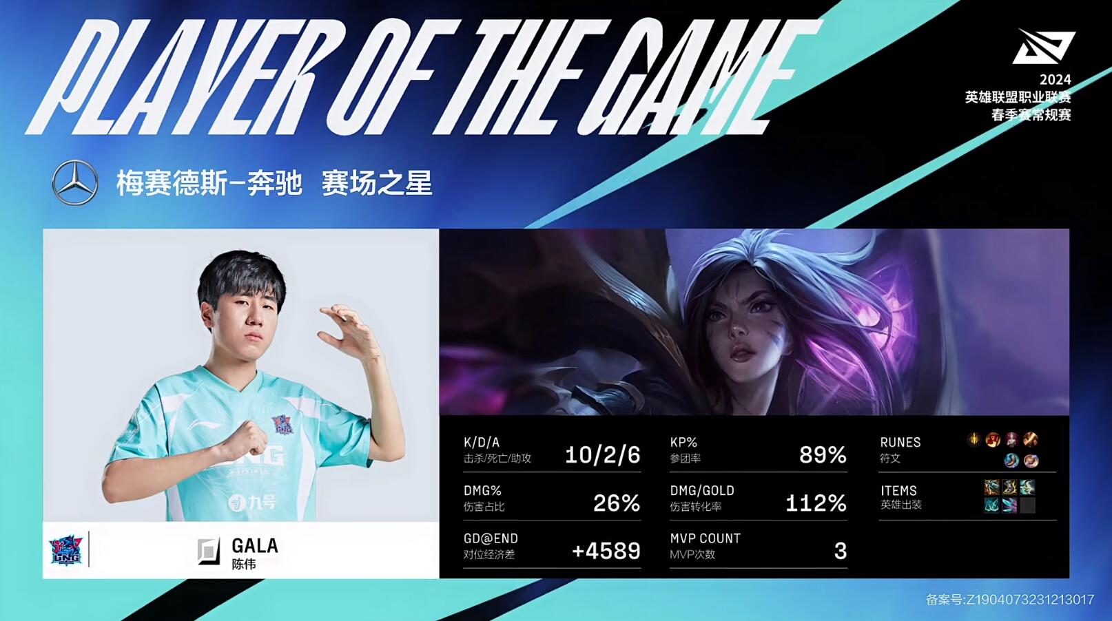 MVP给到了Gala,拿到最熟悉的卡莎,并且对手没有阿卡丽的情况下,Gala还是打出了水准。