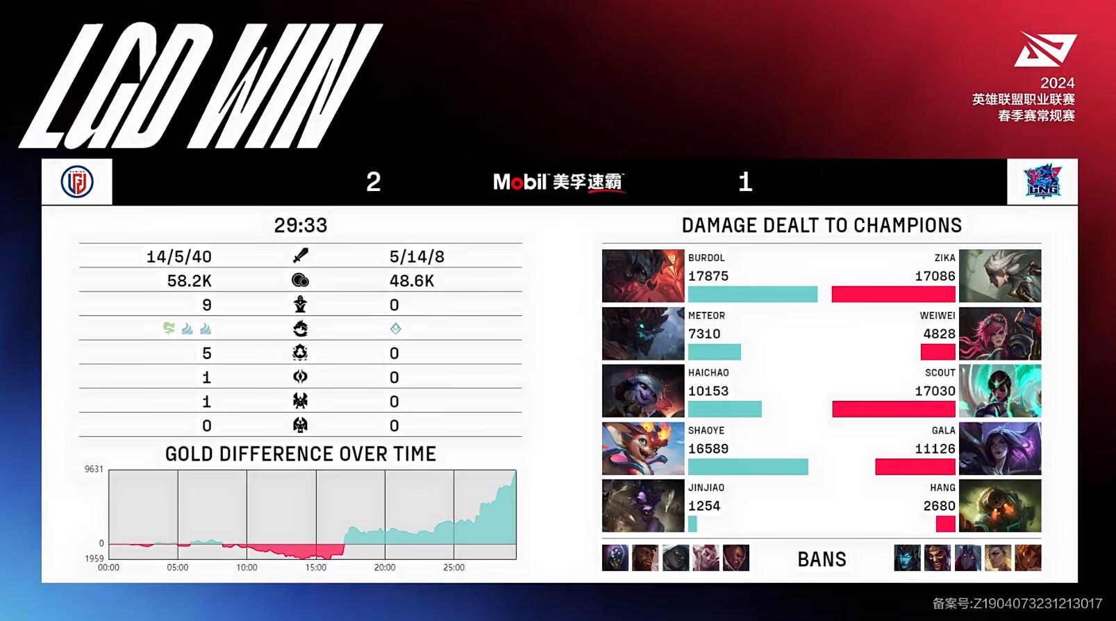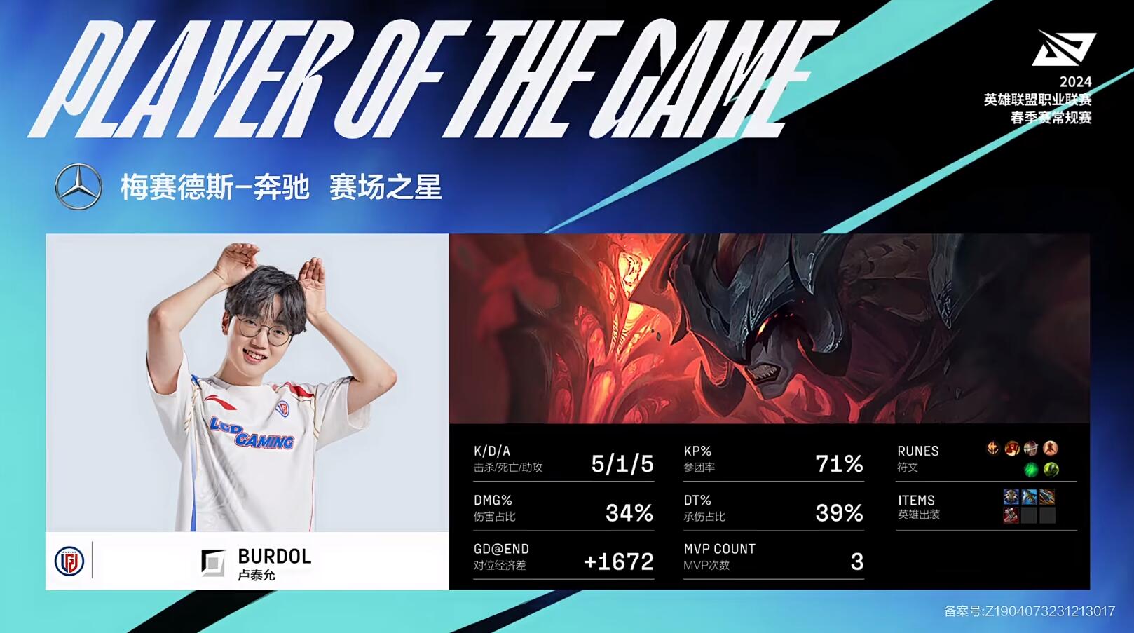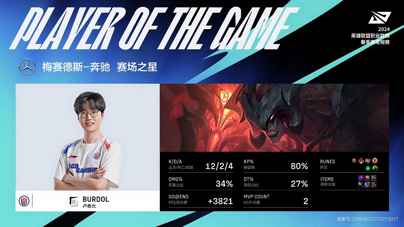 赛后数据,Burdol剑魔砍出全场最高的输出,帮助LGD在中期突然发力,连续两波大龙逼团奠定胜局。