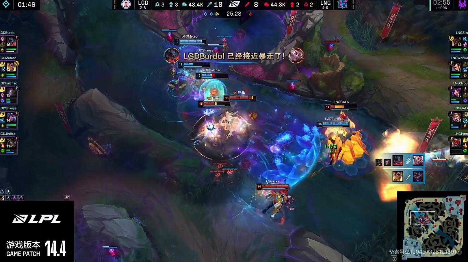 此后LNG阵容缺乏爆发力和收割点的问题无限暴露,Burdol剑魔在团战中宛如天神下凡,一刀一个小朋友,LGD再次打出0换4后一波结束比赛。