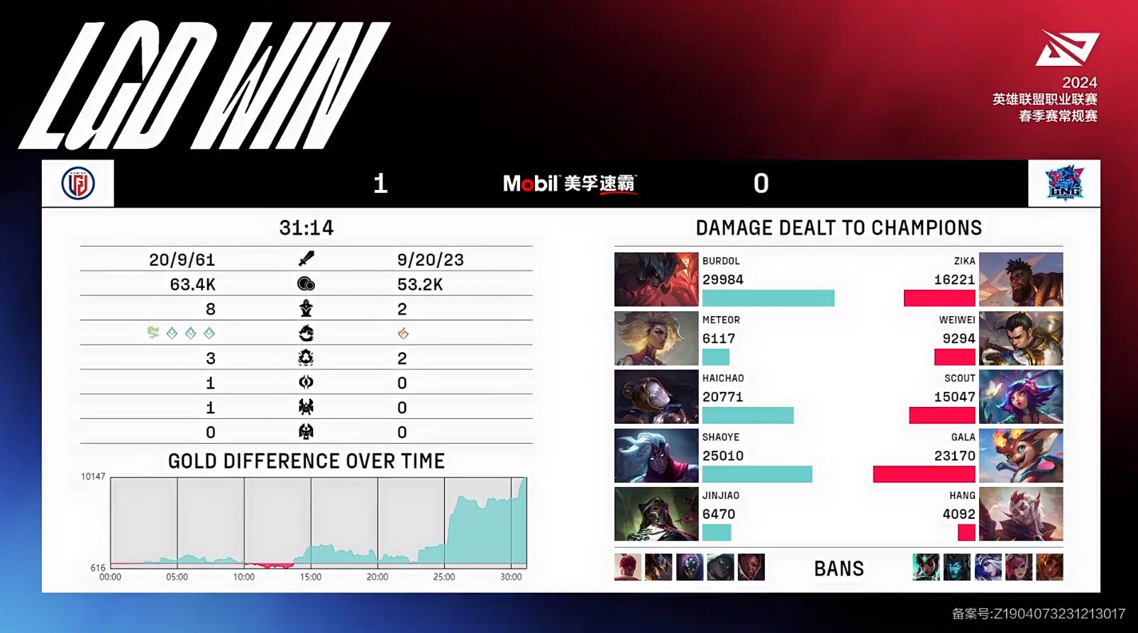 2024年3月8日,LPL春季赛第六周第五个比赛日,LNG对阵LGD,此前LNG连续击败RNG和UP之后似乎已经踏上了北伐之路,因为后续的赛程确实相对轻松。LGD依然保持在两胜队伍的行列之中,但本赛季他们虽然大场输得多,但小场却率有爆发,甚至啃下过一场JDG的小场。