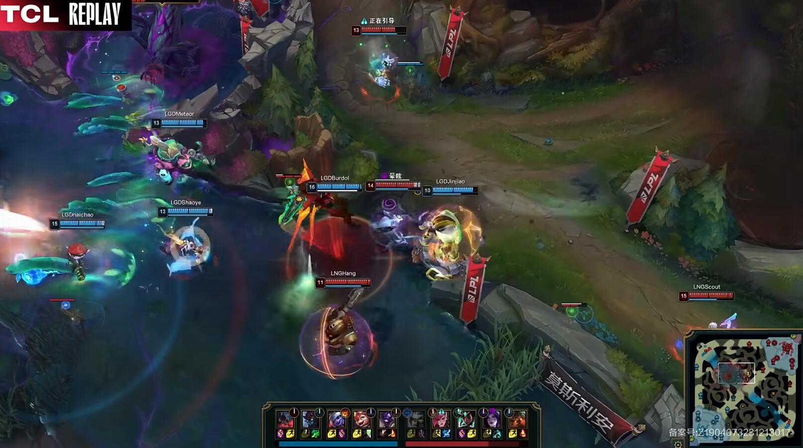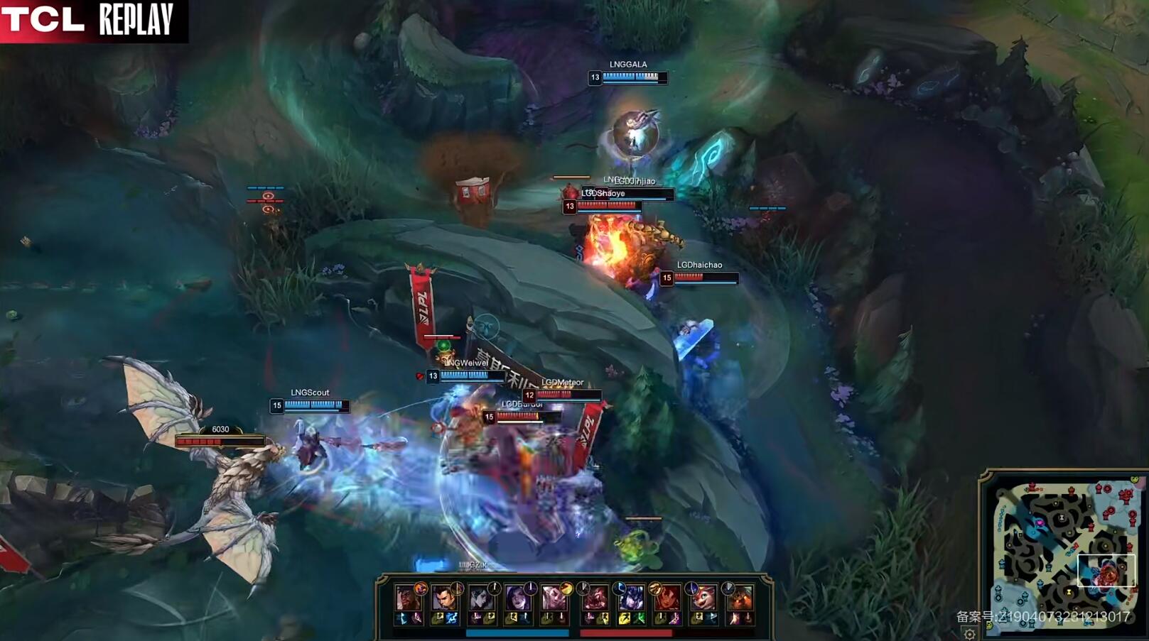 14分钟先锋团妮蔻TP的位置第一时间被LGD发现,被压到起身打残后LNG阵型被分割,LGD打出0换2将经济超出。