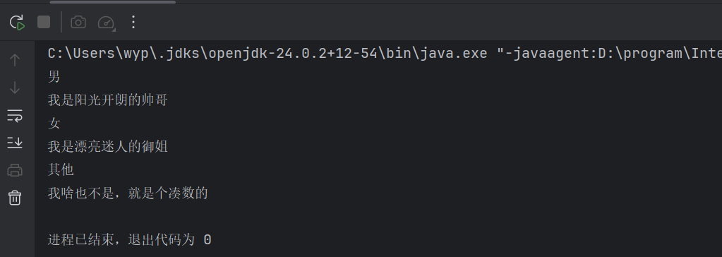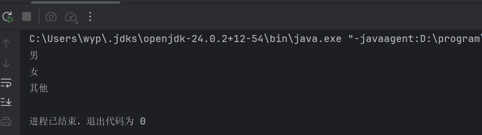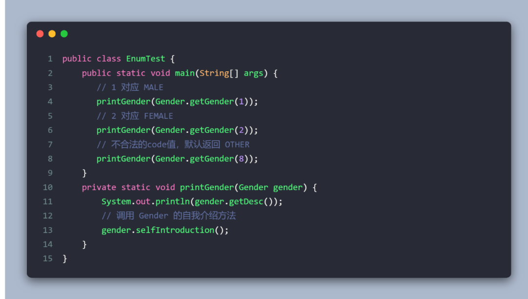 有此定义后便可用该枚举类来进行性别的判断,如:根据枚举值的不同打印其具体含义,下面给出对应的示例: