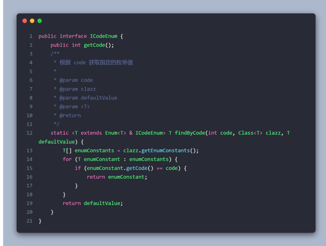 众所周知,java8 之后接口中已支持声明 static 方法,通过这个特性,我们可以声明一些该接口子类都通用的方法。以 ICodeEnum 为例,其子类都必须实现 getCode 方法,因此能根据 code 获取对应的子类。当然因为是枚举的关系,所以应声明为静态方法,并需传入指定的子类枚举的Class 对象。