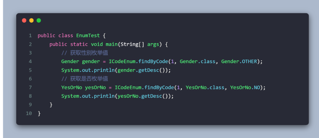 接着给出一个使用 ICodeEnum 的 findByCode 获取其子类指定枚举值的示例,对应示例代码如下所示: