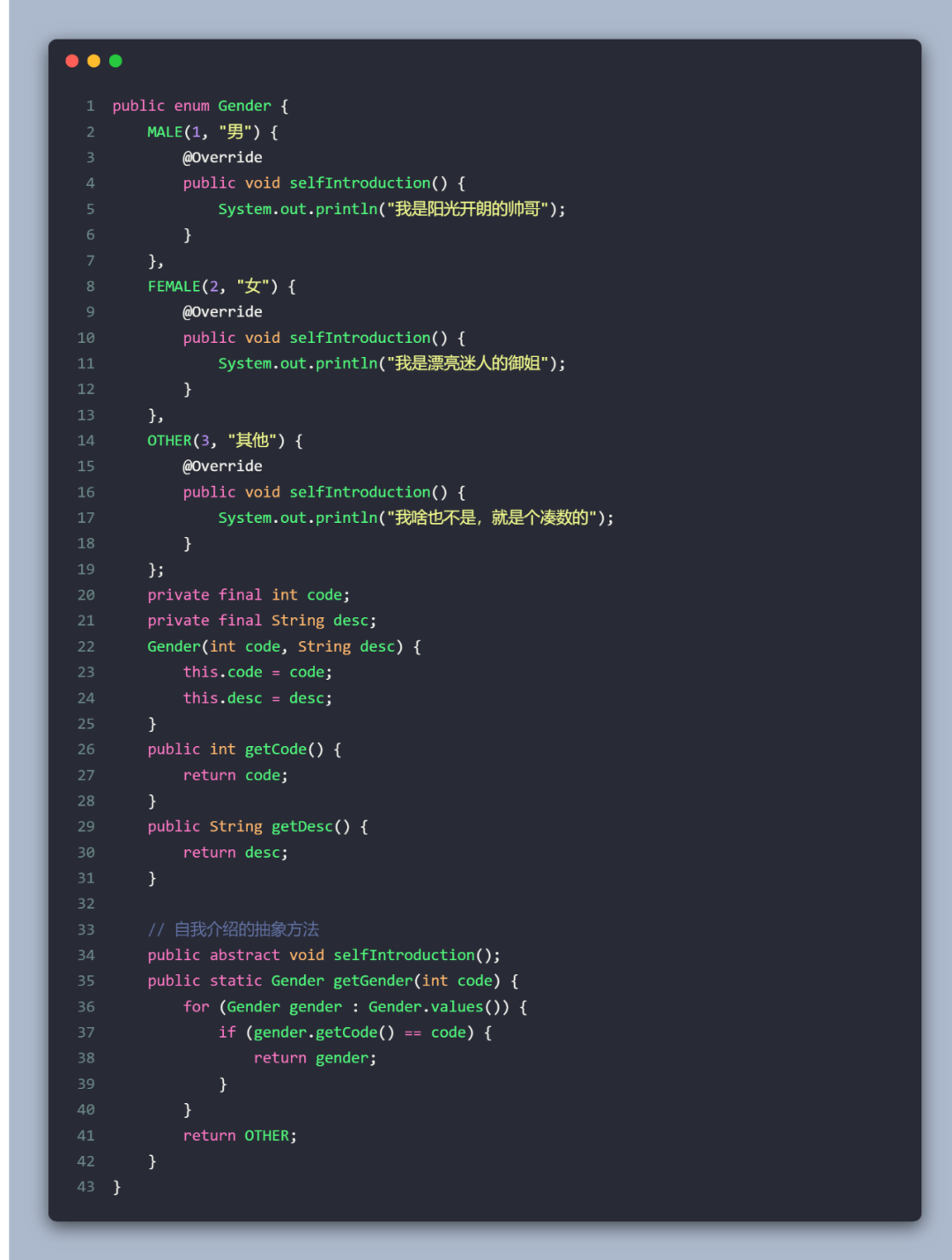 既然枚举也是类,自然也能声明抽象方法,只不过声明抽象方法后,各枚举对象都为该枚举类的匿名内部类对象,如:增加一个 selfInstroduction 方法,即自我介绍方法。修改后的代码如下所示: