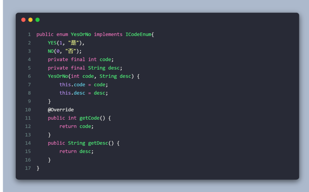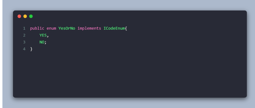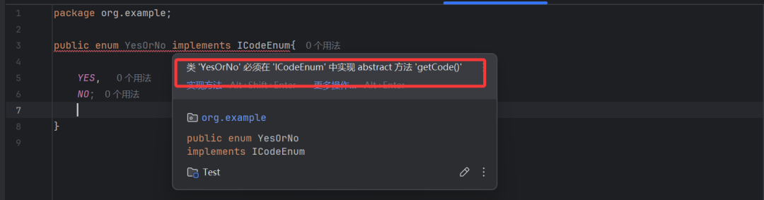 但若未枚举未实现接口中的方法,则会报错。下面再声明一个枚举类,即常见的 YesOrNo枚举,声明代码如下所示: