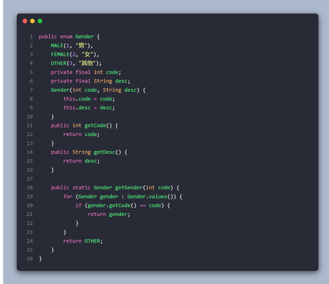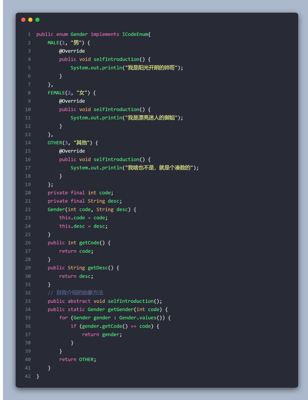 因为 Gender 枚举类已经有getCode 方法,因此可直接实现,而不会报错,下面为 Gender 实现 ICodeEnum 接口的示例代码: