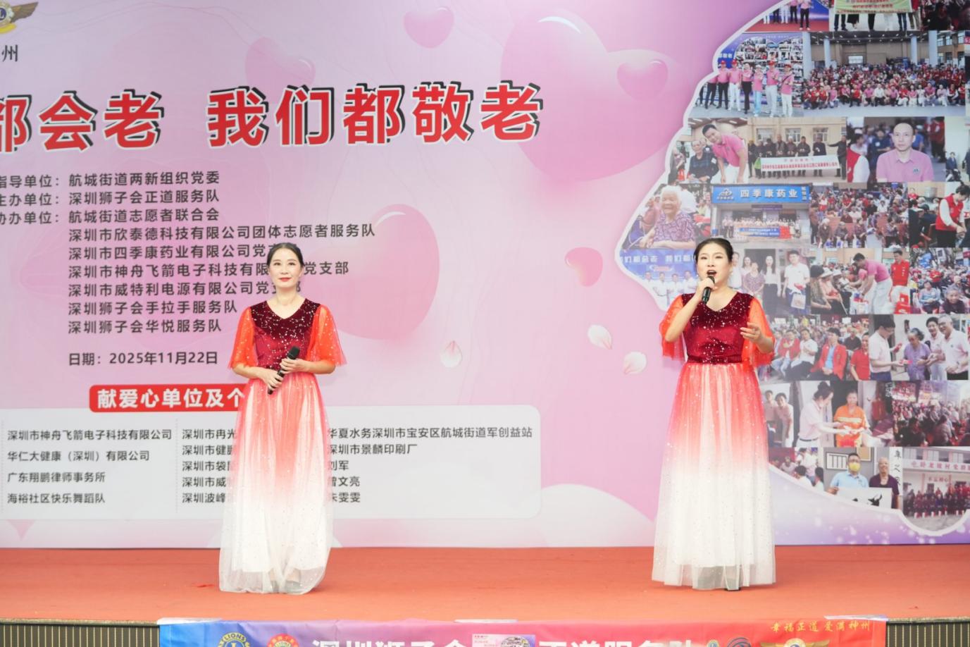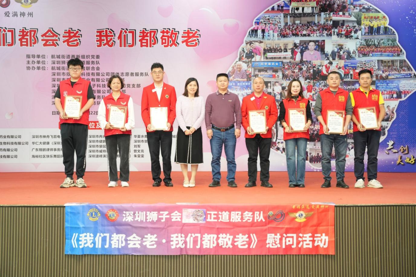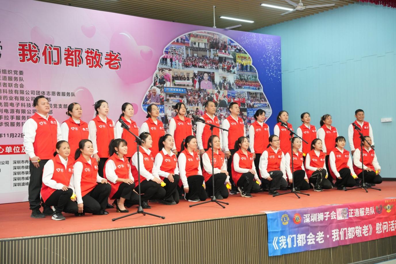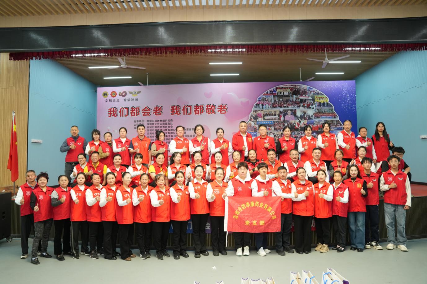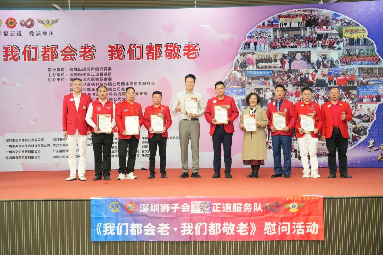 金秋送爽,温情满溢。2025 年 11 月 22 日,深圳市宝安区航城街道九围社区热闹非凡,一场以 “我们都会老,我们都敬老” 为主题的爱老公益活动在此温情落幕。活动由深圳市宝安区航城街道两新组织党委指导,深圳狮子会正道服务队主办,航城街道志愿者联合会、深圳市四季康药业有限公司党支部,深圳市欣泰德科技有限公司团体志愿者服务队,深圳市神舟飞箭电子科技有限公司党支部,深圳市威特利电源有限公司党支部,深圳狮子会手拉手服务队,深圳狮子会华悦服务队协办,为九围社区200 位70 岁以上老年人及贫困残障人士送上关怀慰问活动!深圳狮子会正道服务队已经连续14年在此开展敬老助残关爱慰问活动,出席本次活动的有宝安区航城街道九围社区党委书记周博文同志,宝安区航城街道九围社区党委副书记罗慧玲同志,宝安区航城街道志愿者联合会理事长王贵峰同志,本届敬老大会主席邓俊杰,深圳狮子会会长赵辉,狮子会正道服务队队长何志长,深圳狮子会十二分区主席王元才,深圳狮子会十四分区主席刘军,深圳狮子会创队委主席李秀芳,狮子会手拉手服务队队长刘楚涛,狮子会华悦服务队队长刘海,正道服务队第一副队长李华、第二副队长梁玉辉、第三副队长杨景麟、欧阳炳涛,李小娟、黄志勇、陈斌、范伟保,林欣、王晓妹、郑周强和各队友狮友、深圳市袋鼠健身俱乐部总经理姜湫洋、航城志联理事邓小玉、叶满娣、欣泰德公司团体志愿服务队队长王玉龙等积极参与。