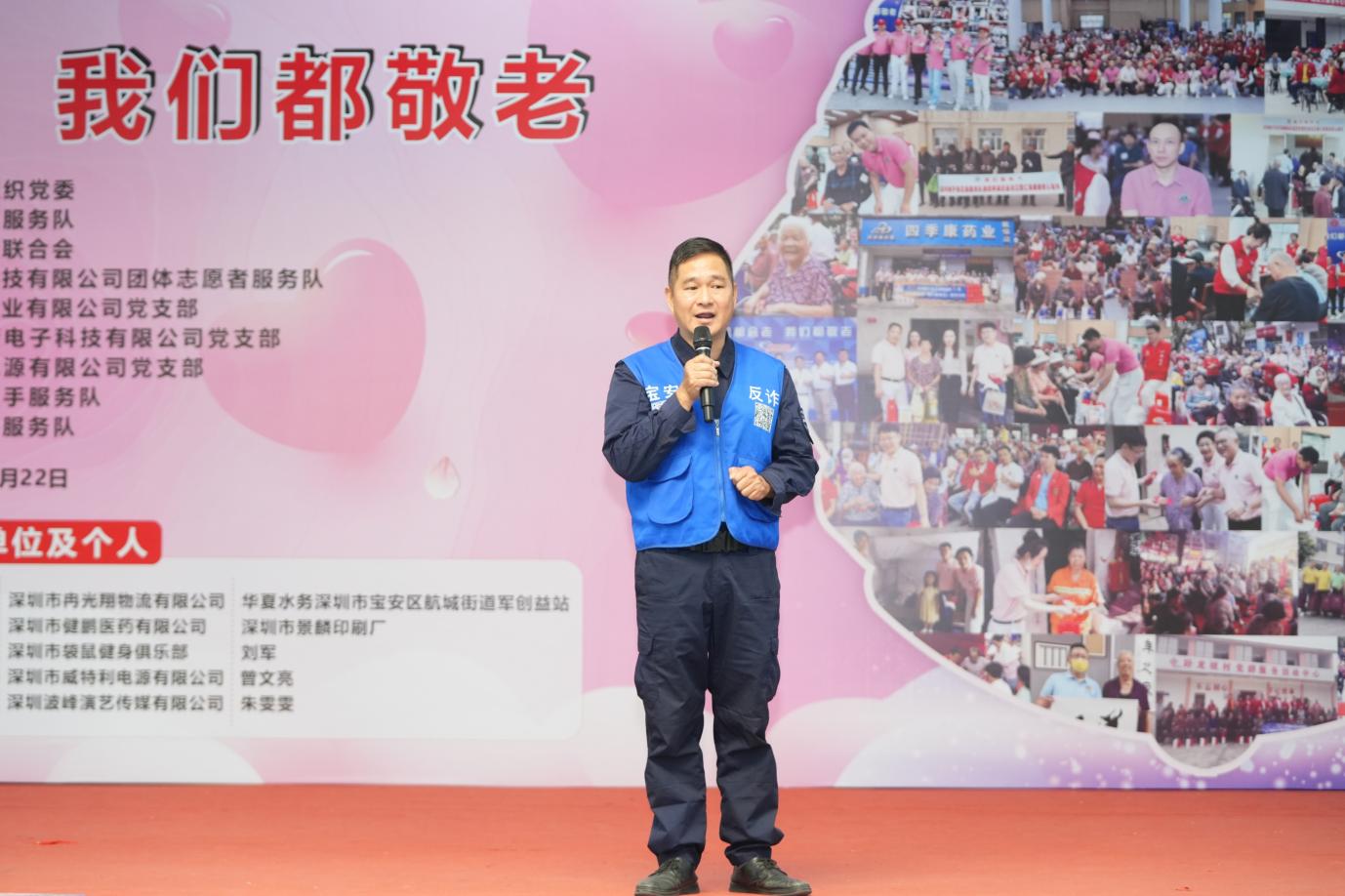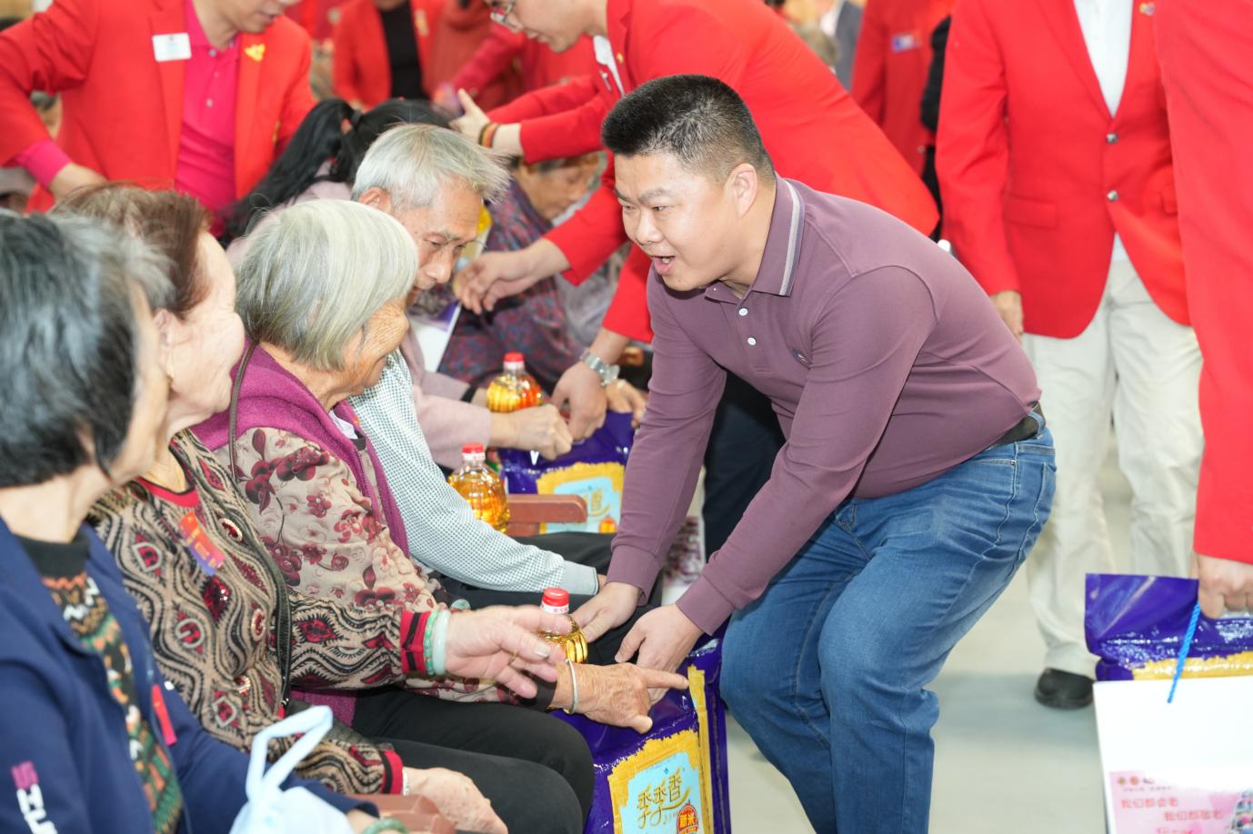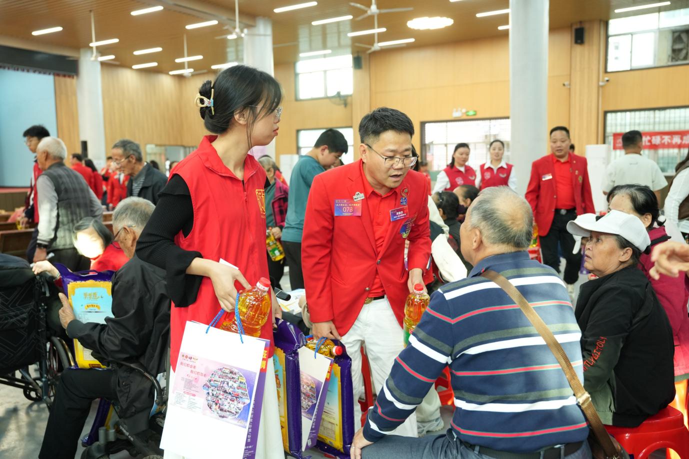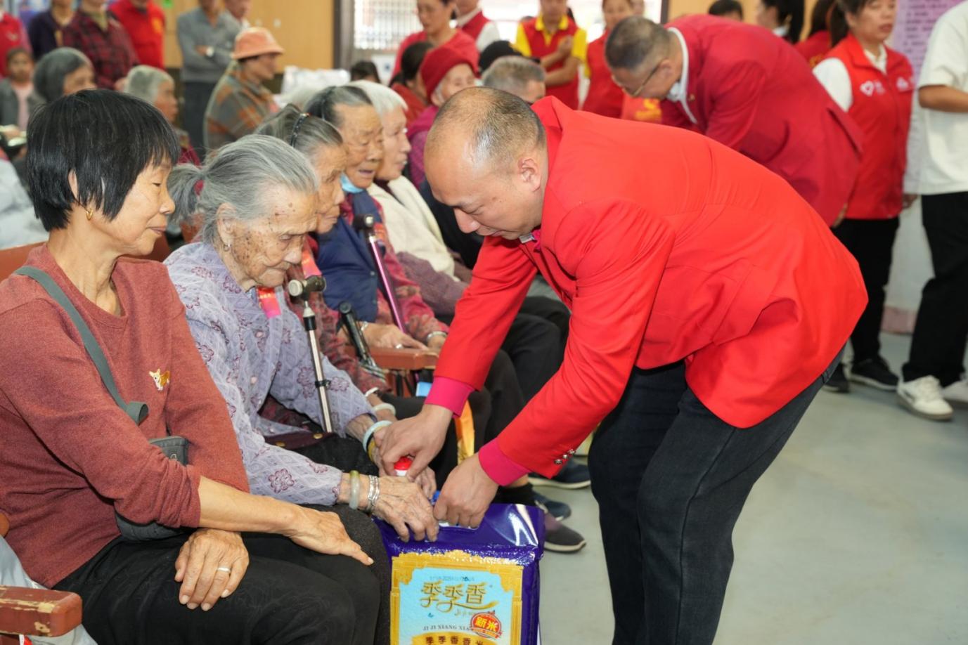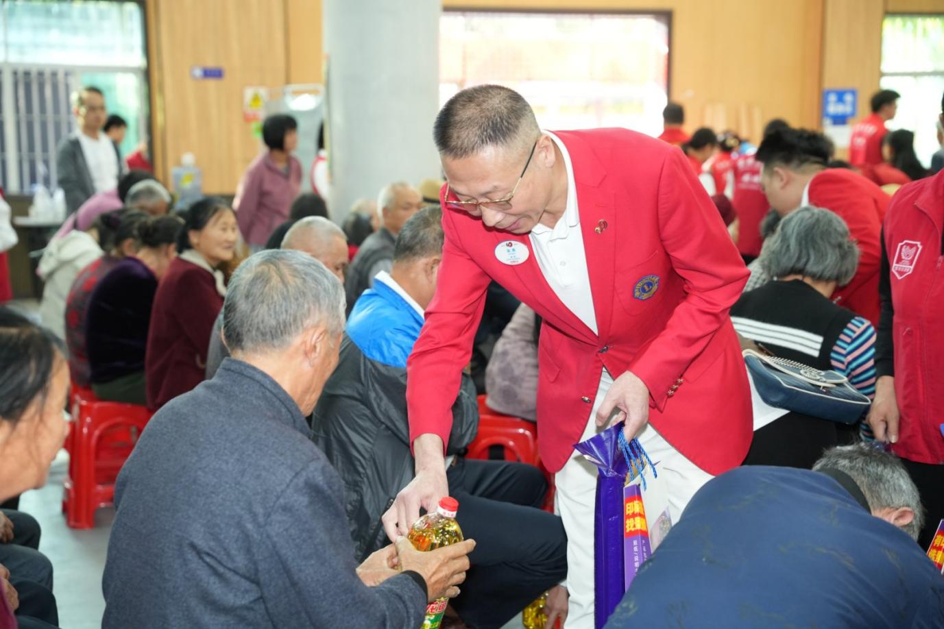 金秋送爽,温情满溢。2025 年 11 月 22 日,深圳市宝安区航城街道九围社区热闹非凡,一场以 “我们都会老,我们都敬老” 为主题的爱老公益活动在此温情落幕。活动由深圳市宝安区航城街道两新组织党委指导,深圳狮子会正道服务队主办,航城街道志愿者联合会、深圳市四季康药业有限公司党支部,深圳市欣泰德科技有限公司团体志愿者服务队,深圳市神舟飞箭电子科技有限公司党支部,深圳市威特利电源有限公司党支部,深圳狮子会手拉手服务队,深圳狮子会华悦服务队协办,为九围社区200 位70 岁以上老年人及贫困残障人士送上关怀慰问活动!深圳狮子会正道服务队已经连续14年在此开展敬老助残关爱慰问活动,出席本次活动的有宝安区航城街道九围社区党委书记周博文同志,宝安区航城街道九围社区党委副书记罗慧玲同志,宝安区航城街道志愿者联合会理事长王贵峰同志,本届敬老大会主席邓俊杰,深圳狮子会会长赵辉,狮子会正道服务队队长何志长,深圳狮子会十二分区主席王元才,深圳狮子会十四分区主席刘军,深圳狮子会创队委主席李秀芳,狮子会手拉手服务队队长刘楚涛,狮子会华悦服务队队长刘海,正道服务队第一副队长李华、第二副队长梁玉辉、第三副队长杨景麟、欧阳炳涛,李小娟、黄志勇、陈斌、范伟保,林欣、王晓妹、郑周强和各队友狮友、深圳市袋鼠健身俱乐部总经理姜湫洋、航城志联理事邓小玉、叶满娣、欣泰德公司团体志愿服务队队长王玉龙等积极参与。