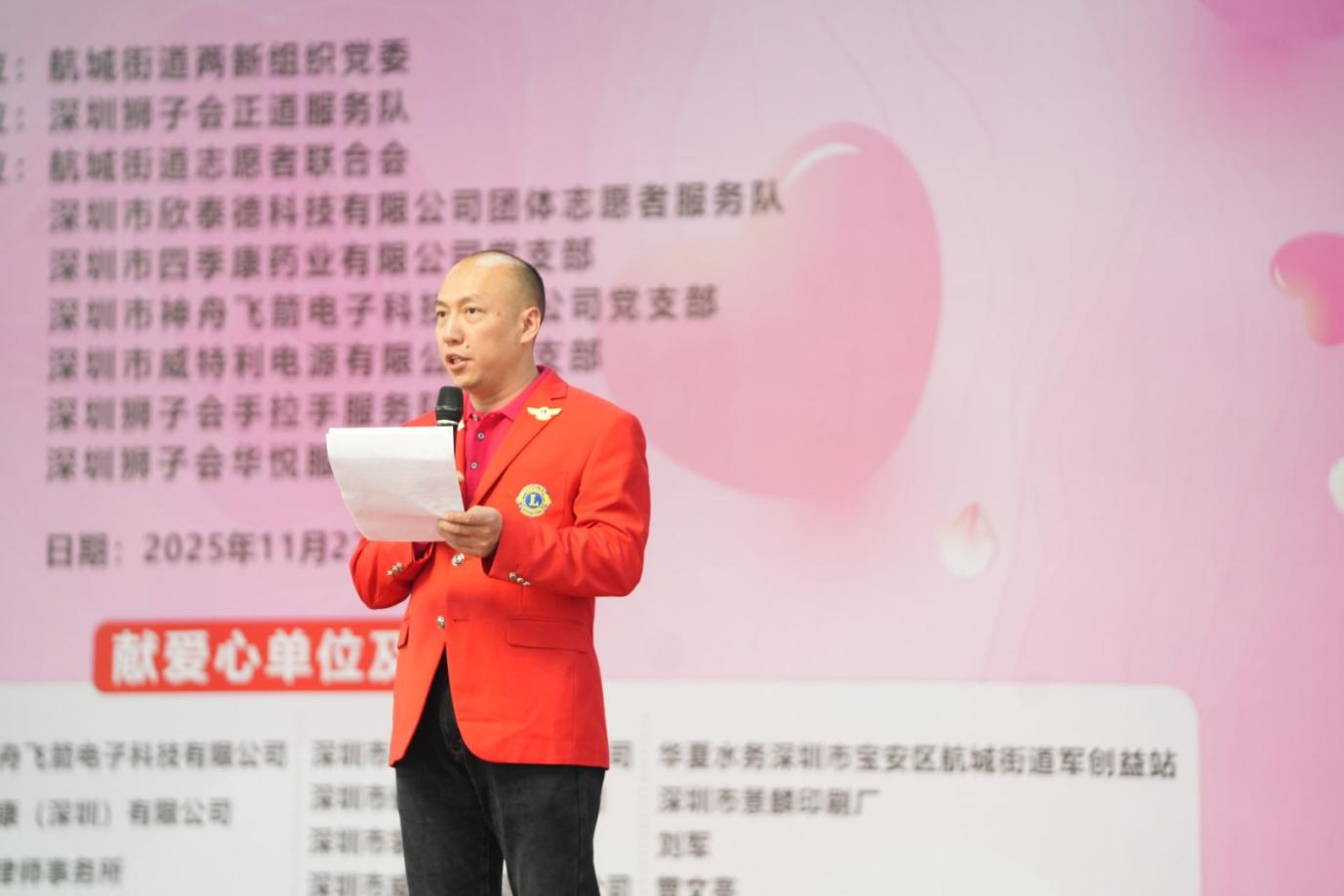 随后,活动进入正式仪式环节。主持人详细介绍了活动背景与到场嘉宾,宝安区航城街道九围社区党委书记周博文、党委副书记罗慧玲,深圳狮子会会长赵辉,深圳狮子会正道服务队队长何志长等多位领导嘉宾莅临现场,共同见证这场爱心盛宴。