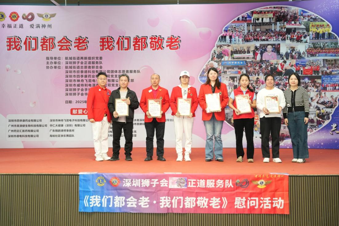 为感谢各单位与个人对活动的大力支持,现场举行了纪念证书颁发仪式。周博文书记、王贵峰理事长、罗慧玲副书记、大会主席邓俊杰,深圳狮子会会长赵辉,何志长队长等分别为协办单位、志愿者代表、赞助单位与个人颁发证书,感谢他们为公益事业的无私奉献。宝安区航城街道九围社区党委书记周博文在总结发言中肯定了活动的意义,并嘱托大家持续践行尊老敬老美德,让老年群体切实感受到社会关怀。