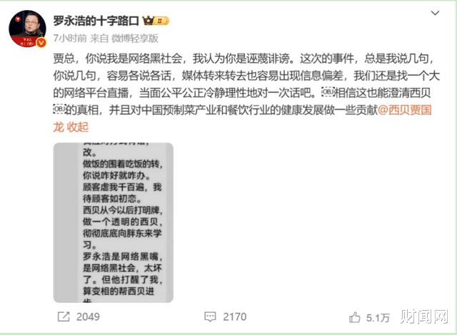 战火升级!9月14日风波出现戏剧性转折。西贝创始人贾国龙在行业群内发言截图流出,前半段称“我应对方式有错,改”,后半段却指责罗永浩是“网络黑社会”,但承认其“打醒”了西贝,并表示将向胖东来学习,打造透明厨房。罗永浩随即发文反击:“这件事我们没法揭过去了,再劝我的朋友一律绝交。”他呼吁双方在大型网络平台直播对质,澄清真相。