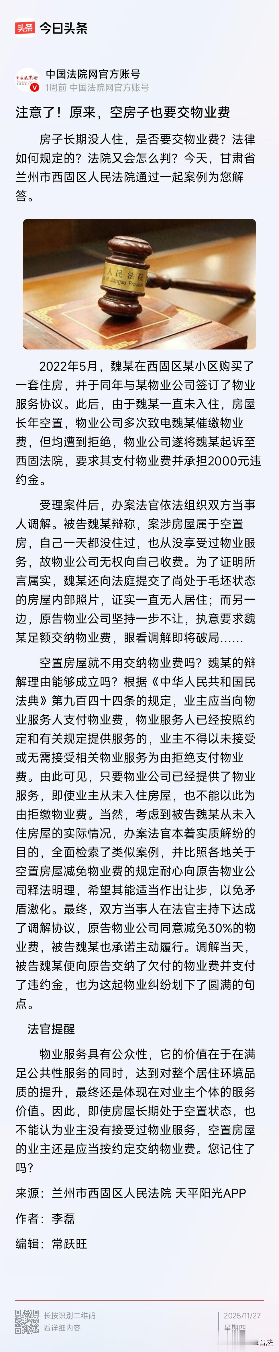 房子长期没人住,是否要交物业费?法律如何规定的?法院又会怎么判?甘肃兰州,一男子在当地小区买了一套房产,但是一直没有入住,处于闲置状态,小区物业几次要求交物业费,拒绝之后直接起诉到法院,经过调解,该男子还是支付了部分物业费!网友纷纷留言:物业为何狂妄,因为背后有法院和所谓“公正”的法律为其背书。