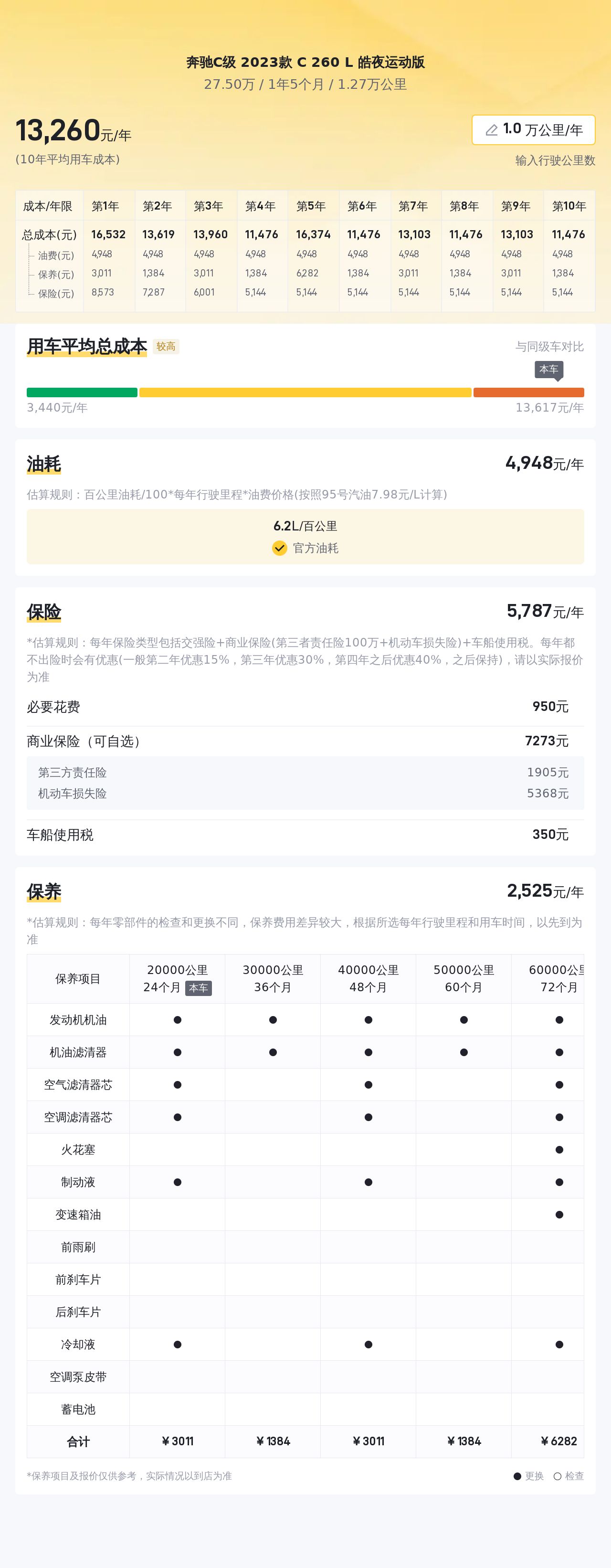 另外,同级车的最低10年平均用车成本是7507元/年,最高是17220元/年,奔驰C级 2023款 C 260 L 皓夜运动版是13463元/年,适中的水准,不过也与它较高的售价有关。