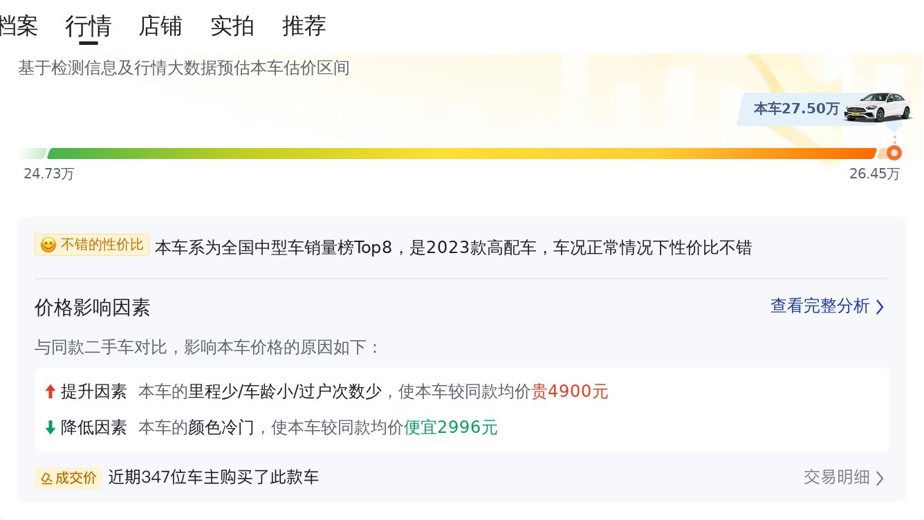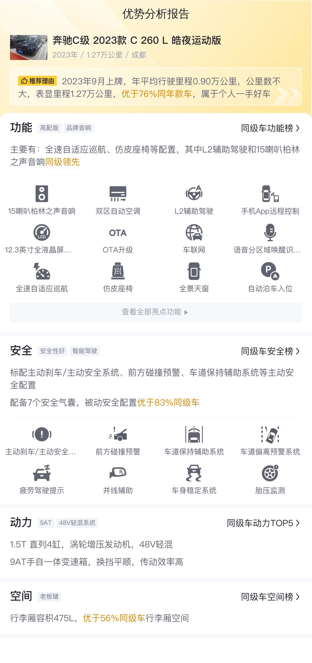 咱们今天介绍的这辆二手奔驰C级,具体版本是——奔驰C级 2023款 C 260 L 皓夜运动版,新车含税价为41.20万,现在的二手车报价是27.50万,相当于开1年多便宜了14.20万。