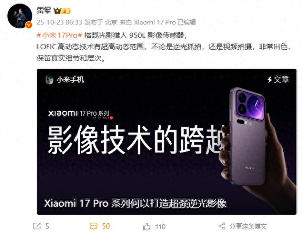 快科技10月23日消息,小米17 Pro系列代号“逆光之王”,该系列首发搭载光影猎人950L影像传感器。
