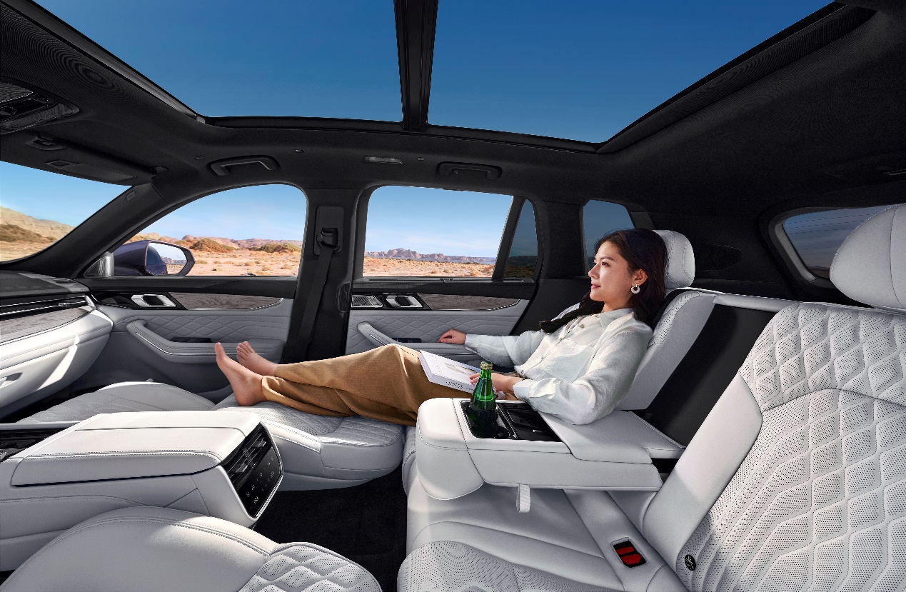 2026款领克09四驱探索版这次将“豪华平权”的理念贯彻得尤为彻底。新车采用大五座布局,后排被打造为“行政级”的享受空间。其坐垫宽度达到1366mm,坐垫深度为540mm,均为同级领先水平,最大腿部空间1130mm,即便三人满座也能保证舒适性。更关键的是,以往在高配新能源车或更高级别车型上才有的座椅通风、加热和8点式背部按摩功能,这次从前排扩展至全车四个座位,均采用Nappa真皮包覆。副驾座椅新增了280mm一体式4向电动腿托,可一键开启半躺模式;二排则新增了多功能中央扶手(放倒后可变为商务四座模式)和承重18kg的小桌板,无论是长途办公、带娃就餐还是放置物品都非常实用。再加上14扬声器的Bose定制音响、海洋之谜香氛系统以及四温区空调,整个座舱的听觉、触觉、嗅觉体验都得到了精细打理。