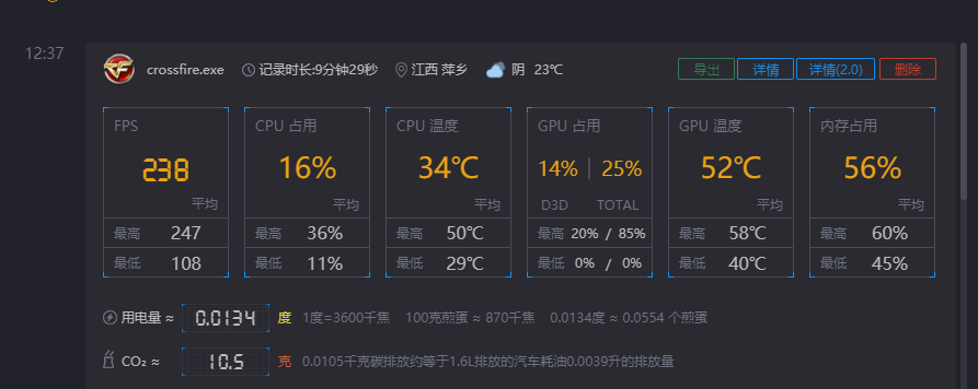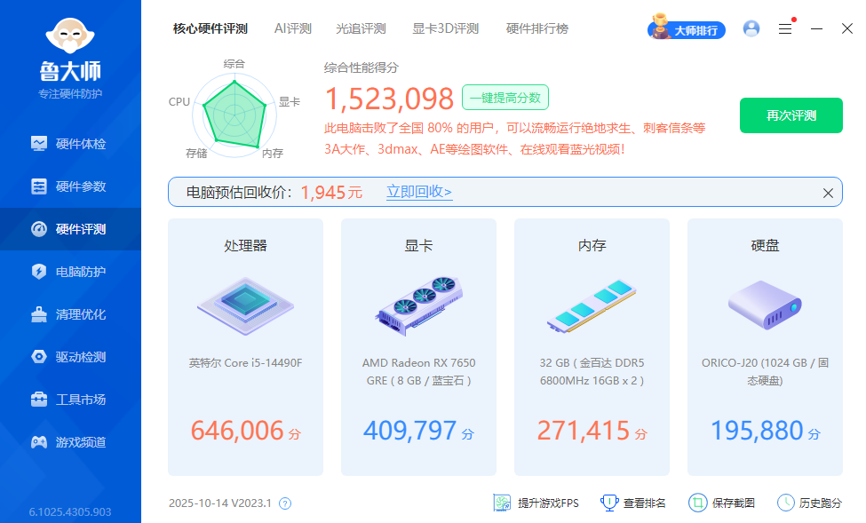 650W 额定功率中,+12V 输出达 649.2W,搭配 105℃日系主电容与 LLC+DC-DC 电路,即使带动 i5 14490KF+7650GRE级别的中高端配置,也能保持稳定输出,大家都知道,AMD的显卡是非常考验电源的,如果电源质量不好,或者是电源输出功率不够,都会出现掉驱动的情况,但是7650GRE搭配GEX650这款电源实际打游戏使用下来没有出现这种情况,表现十分稳定,用鲁大师进行跑分测试表现优异,游戏加加测试游戏帧率也很稳定。