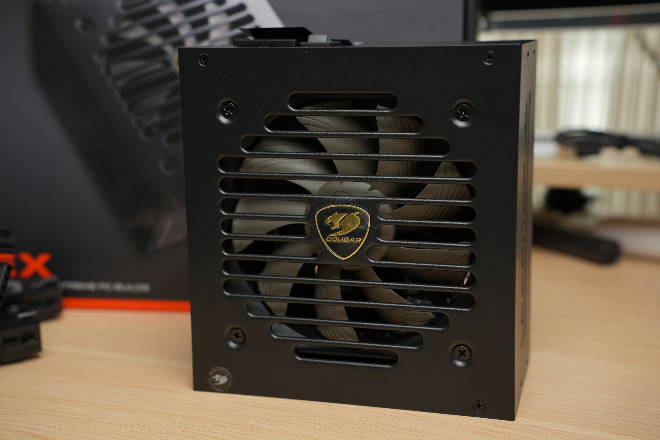 骨伽 GEX650 电源采用黑化处理外壳,虽为黑色基调,但侧面立体的骨伽 LOGO 与白色机箱搭配毫无违和感,反而形成视觉对比。电源出风口的粗犷栅格设计、120mm 智能风扇的导流槽细节,
