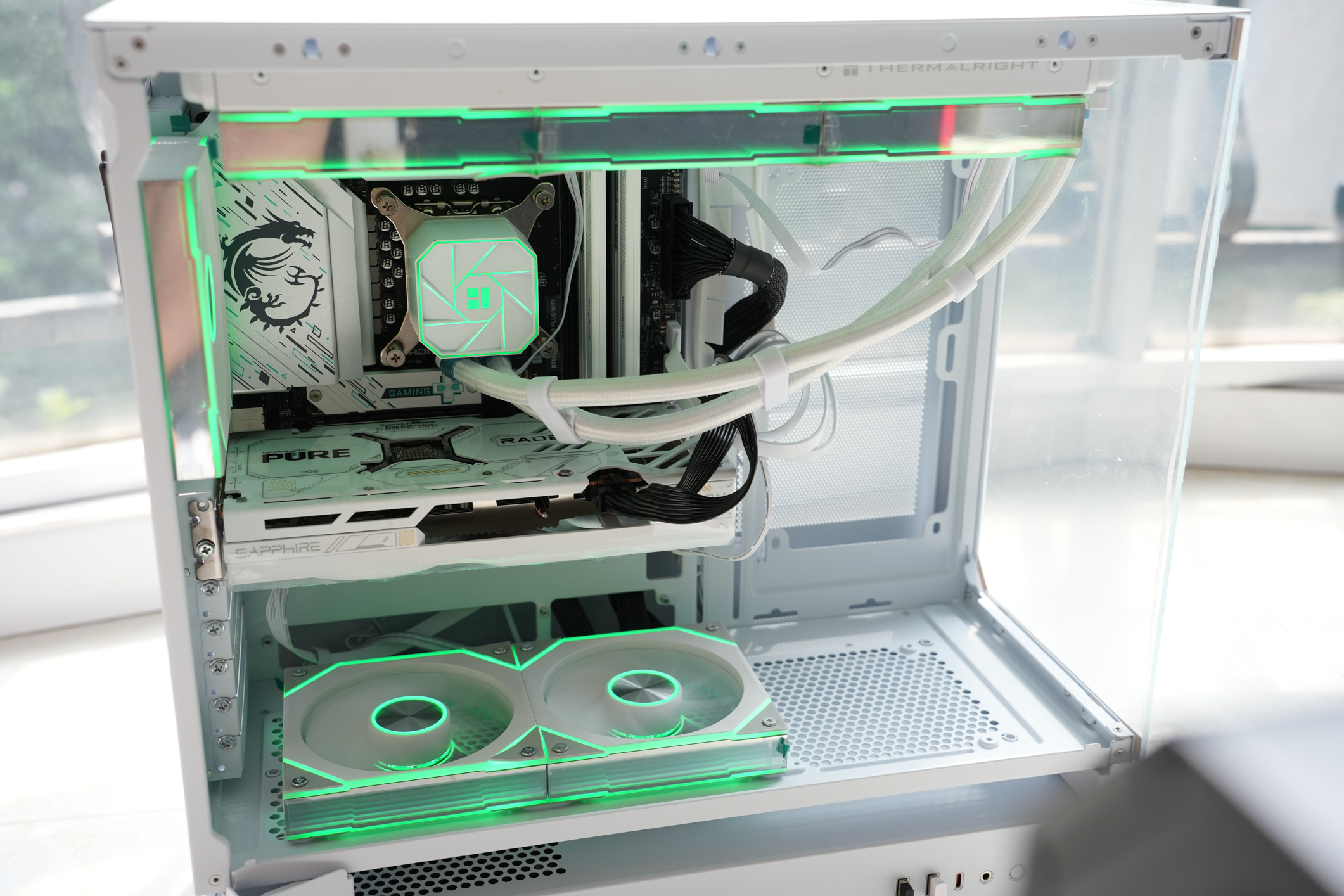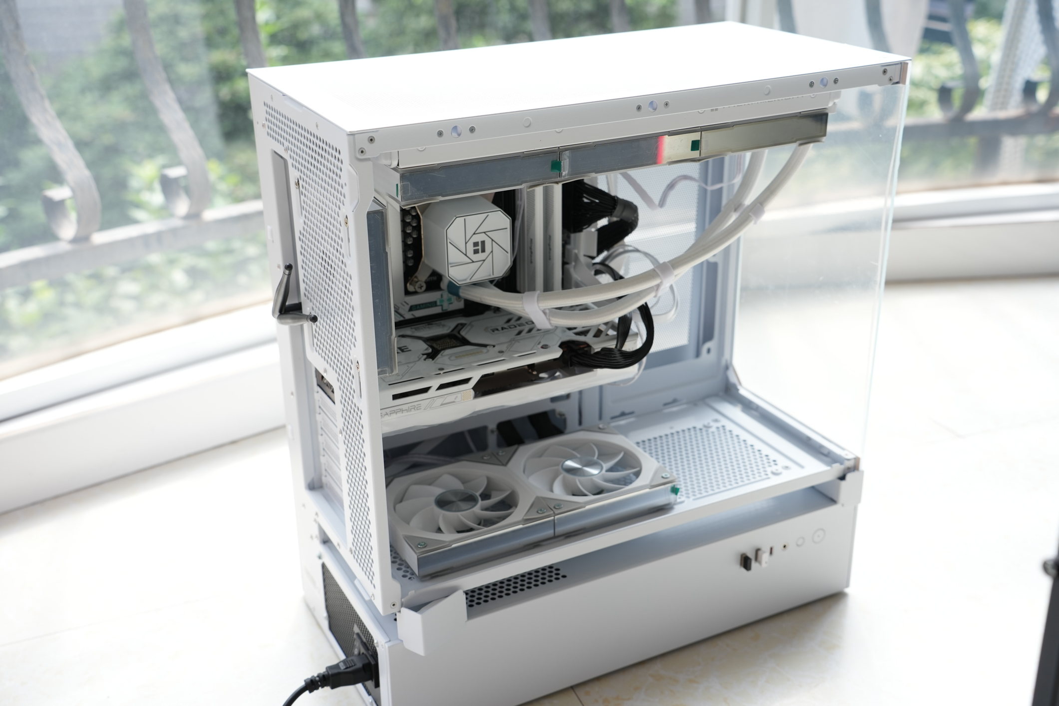 硬件容纳能力完全覆盖主流配置:水冷CPU 散热器、 双风扇显卡、200mm 电源均可轻松装入,我实测安装 360mm 冷排 + 灵镜 V4 风扇三联装时,空间分配依然充裕。