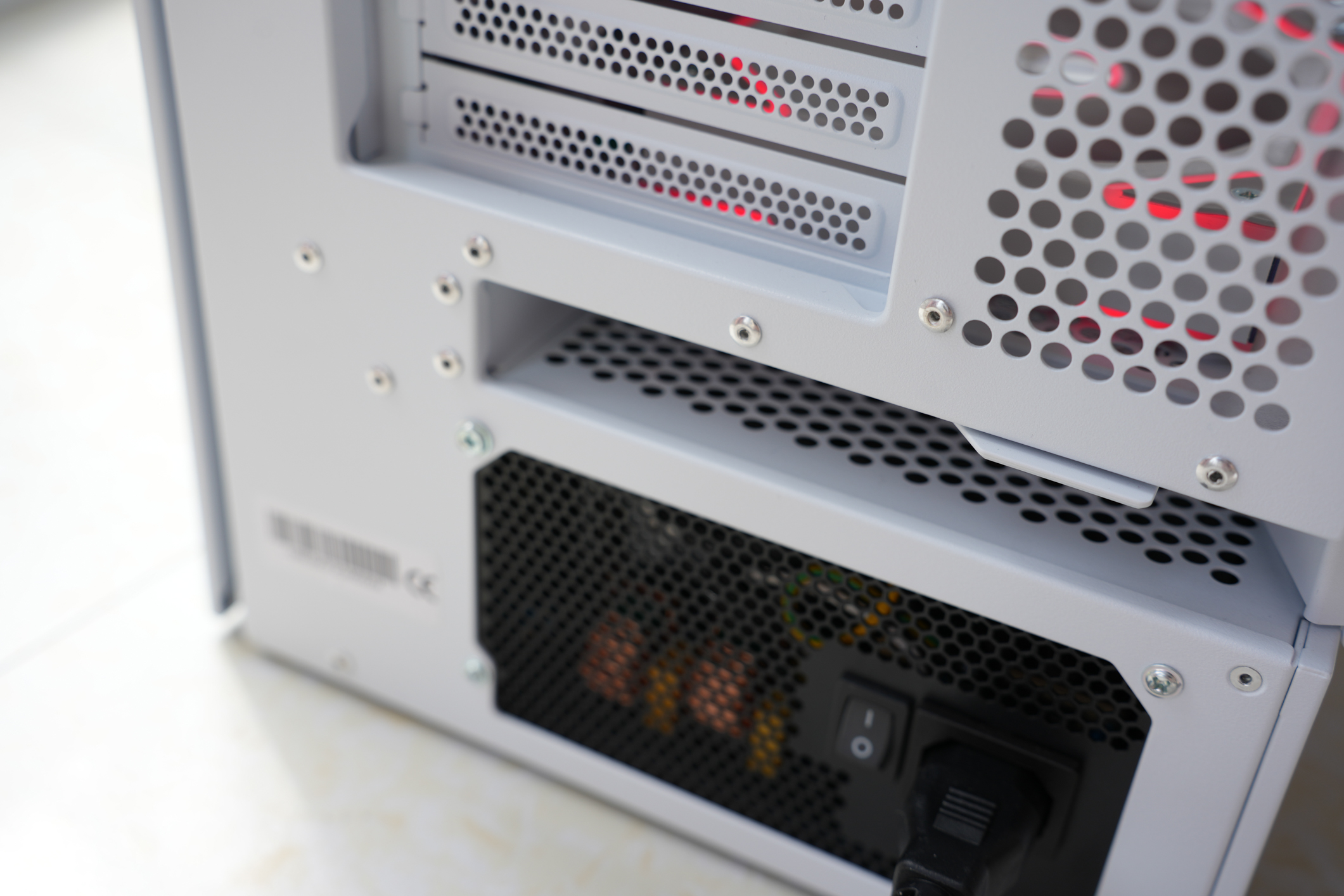 正面与左侧的双面钢化玻璃通透澄澈,搭配边缘细腻的白色喷漆,整体质感远超同价位产品。机箱最具辨识度的是 CFV 中空悬浮气流架构,上下双仓的物理分隔形成开放式通风间隙,通电后宛如悬浮于空中,科技感十足。