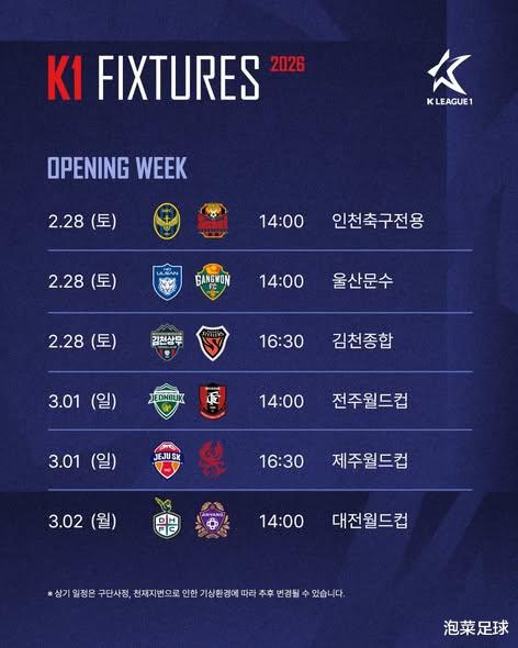 2、26赛季K1联赛2月28日开幕,“京仁德比”打头炮