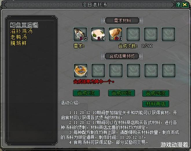 大侠通过参与副本、运镖等玩法收集食材,合成鲫鱼豆腐汤、滋补鸡汤、老鸭汤、腌笃鲜四类汤品。饮汤可得经验、授业点数、装备碎片、兵魄洗炼石等极品道具!
