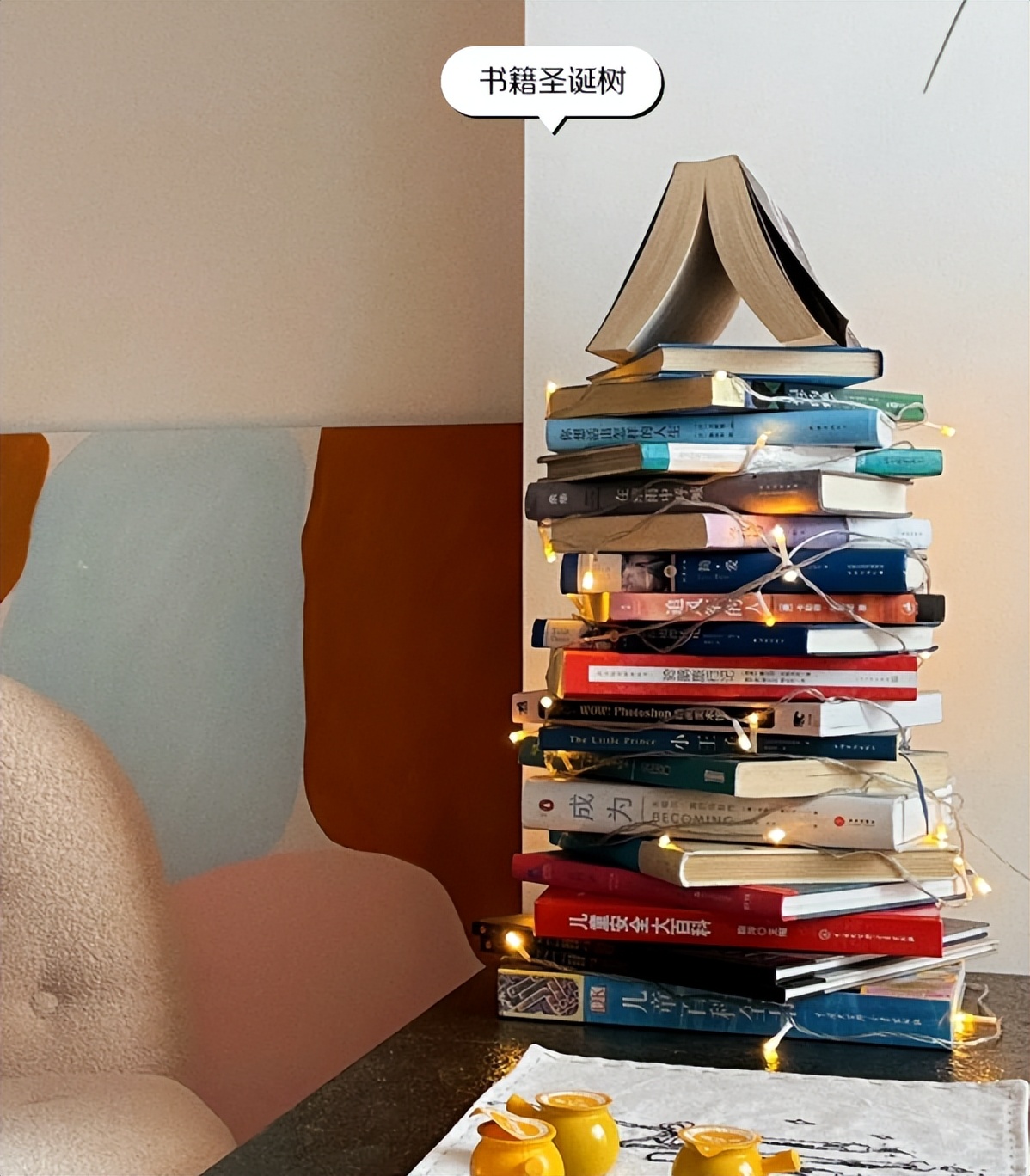 还可以利用书本diy成圣诞树,把书本交错着放,最上面书打开倒着放在最上面,再用串灯装饰一下。