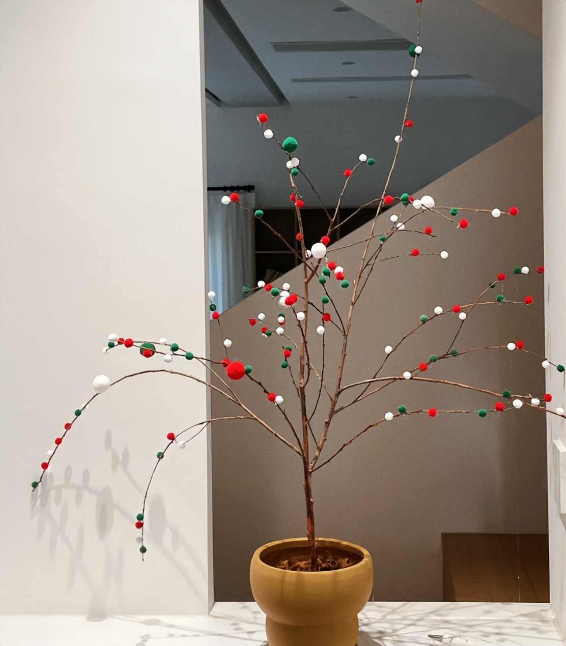 用热熔胶粘贴在枯树枝上面,好看的小摆件就做好,放在家里瞬间增加了节日氛围感。