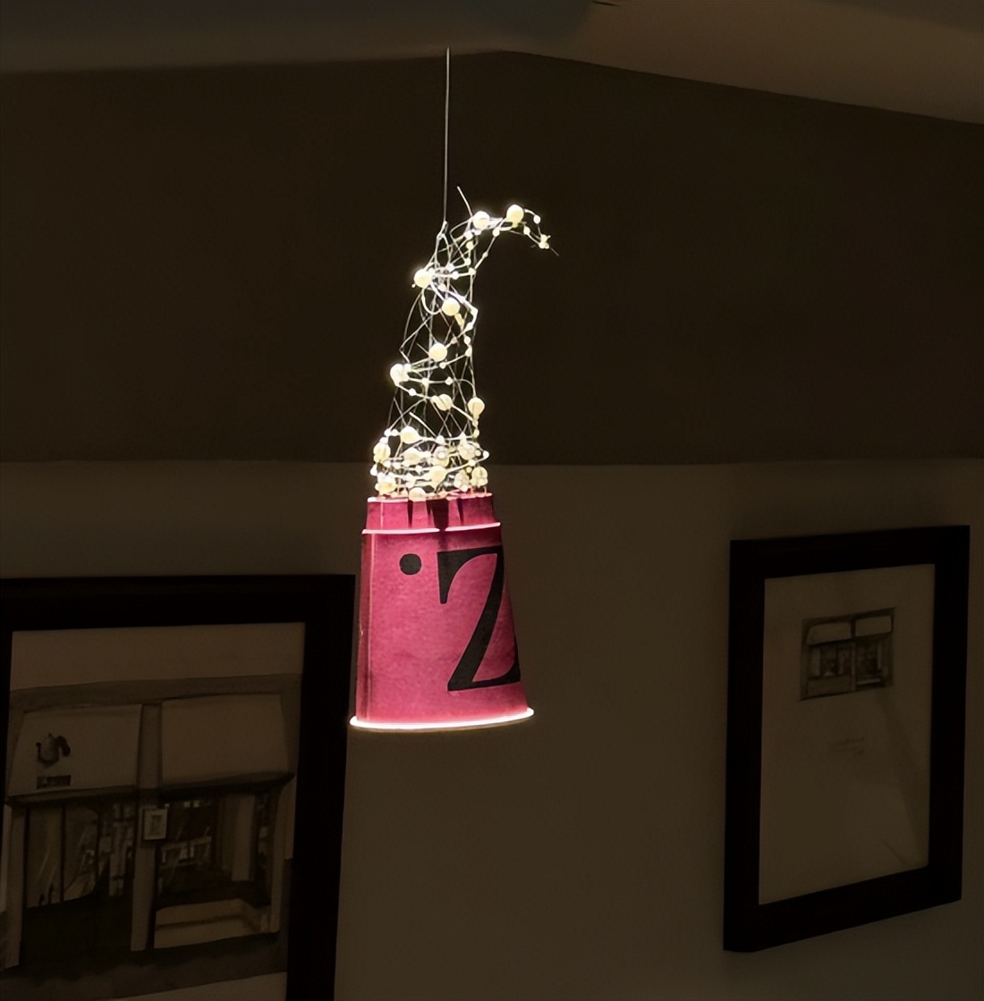 纸杯上面缠绕几圈串灯,点亮之后,挂在家里,真的特别好看,氛围感满分。