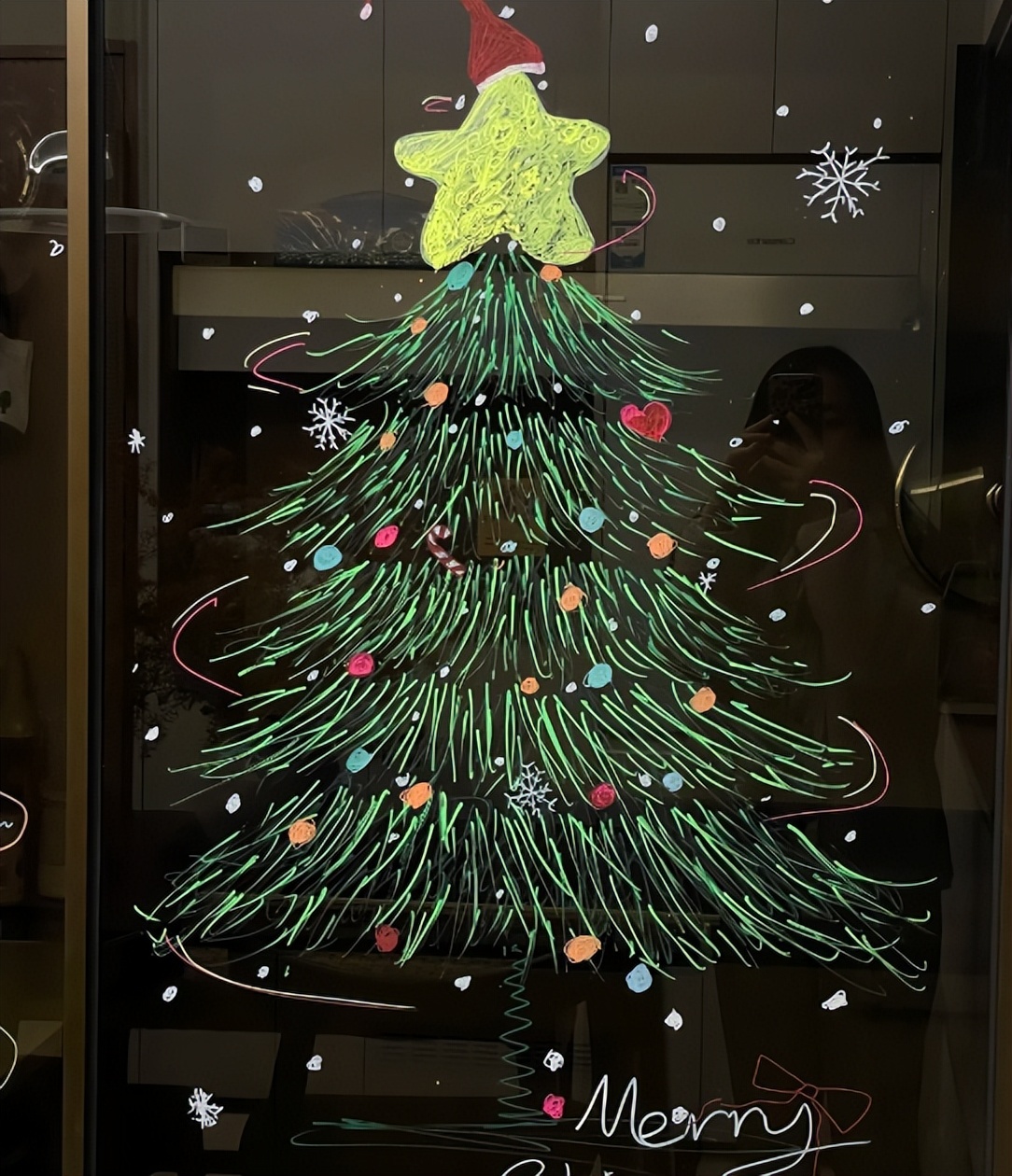 家里没有镜子的话,比如,卫生间玻璃门啊,或者厨房玻璃门……都可以用丙烯笔画出圣诞树、或者写上日历。