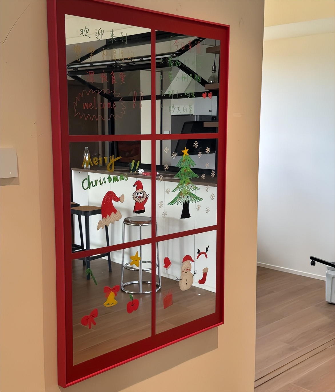 比如,用丙烯笔在镜子上画一些圣诞老人、圣诞树、雪花之类的,画好了之后,家里氛围感瞬间上升了不少。