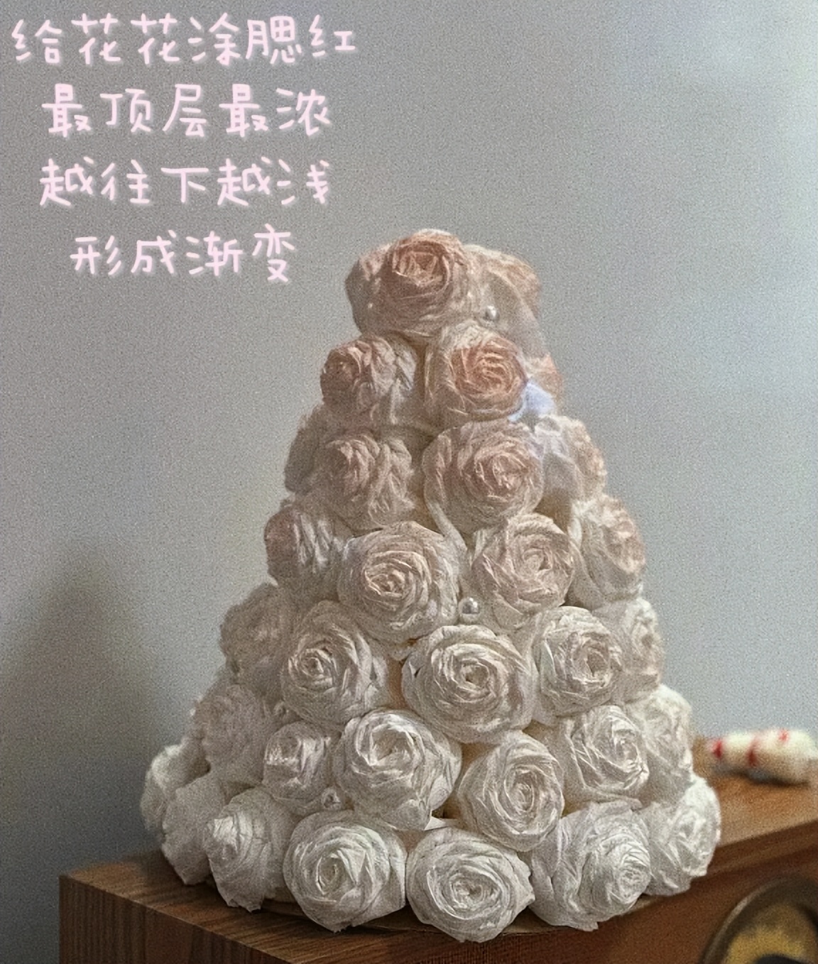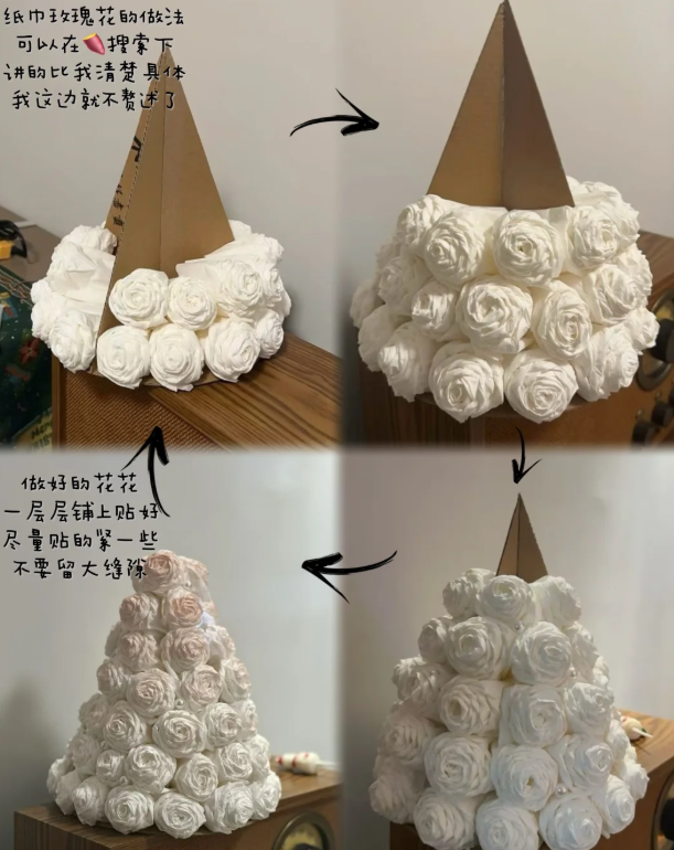 在用卫生纸折叠一些玫瑰花,玫瑰花的做法随便一搜都有,然后一层层粘贴在纸壳上面。