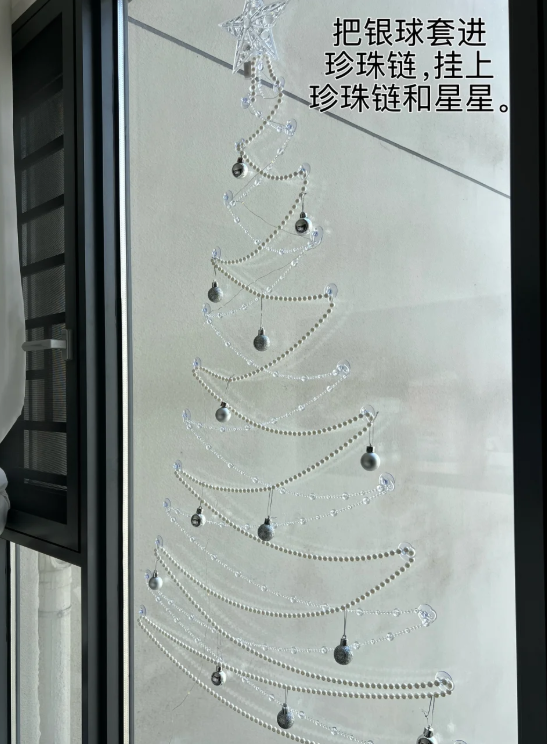在链条两端固定一些吸盘,用串珠穿过吸盘,一层层挂好,再把银球套进珍珠链,在挂上星星。